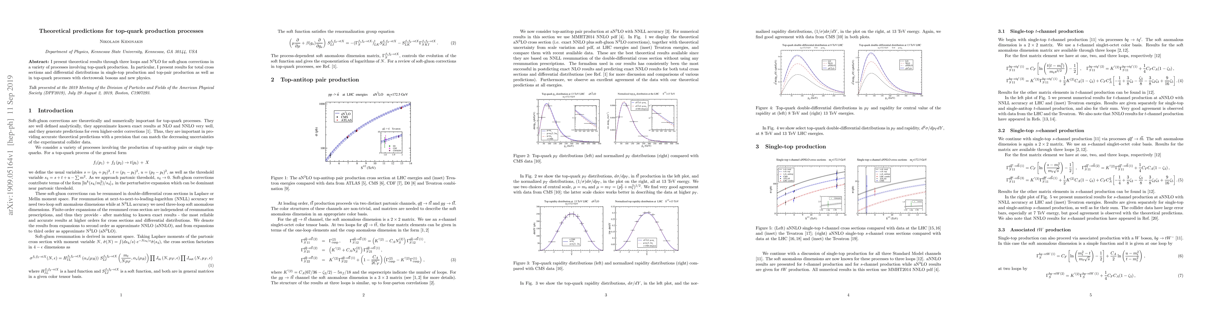 This paper presents theoretical predictions for top-quark production processes, including three-loop and N$^3$LO soft-gluon corrections, focusing on total cross sections and differential distributions in single-top, top-pair, and associated top-quark production.