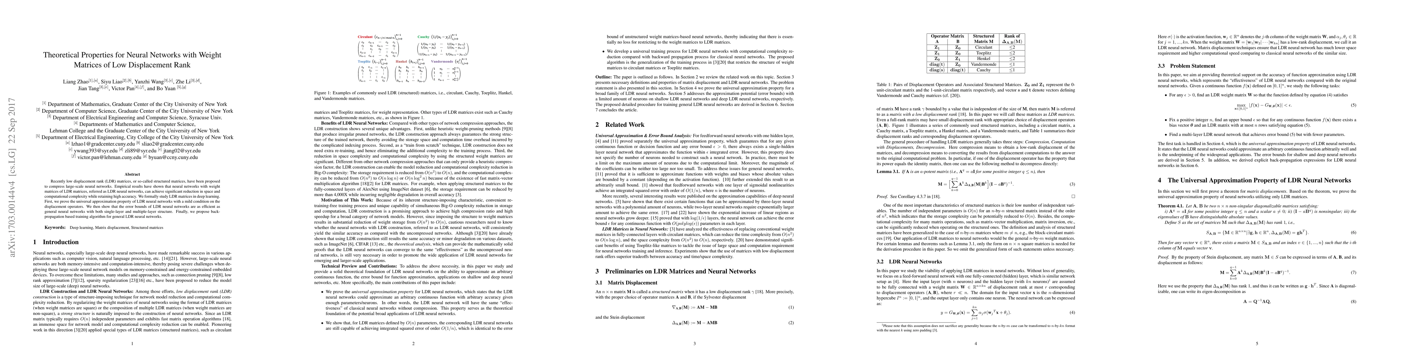 This paper investigates the theoretical properties of neural networks with weight matrices of low displacement rank (LDR), demonstrating their universal approximation and efficient error bounds. It also proposes a back-propagation training algorithm for these structured networks, showing they can compress large-scale neural networks while maintaining high accuracy.