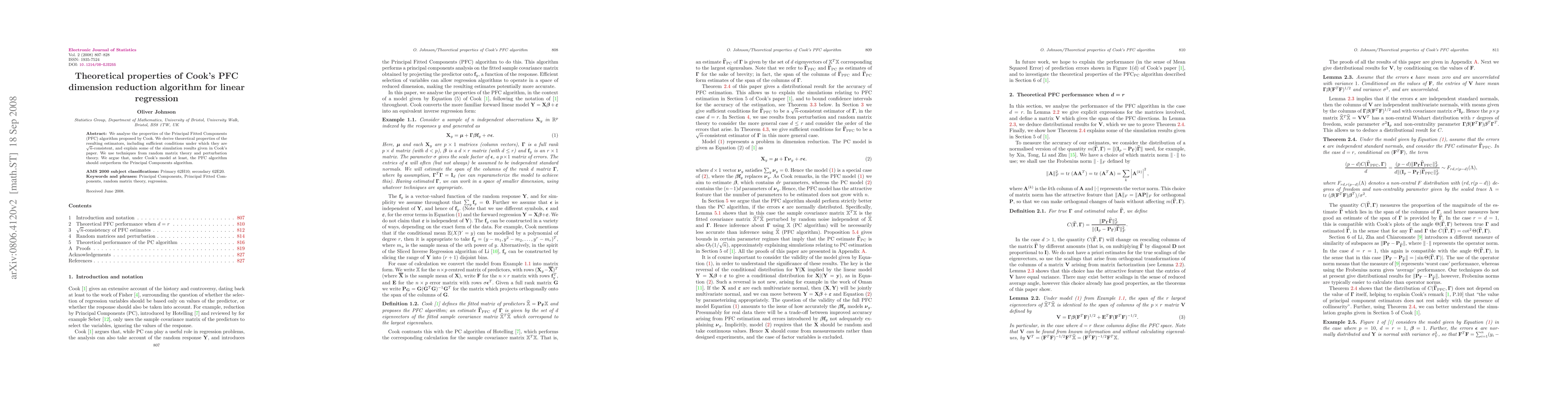 This paper analyzes the theoretical properties of Cook's PFC dimension reduction algorithm for linear regression, showing it is $ oot{n}$-consistent under certain conditions, potentially outperforming Principal Components algorithm.
