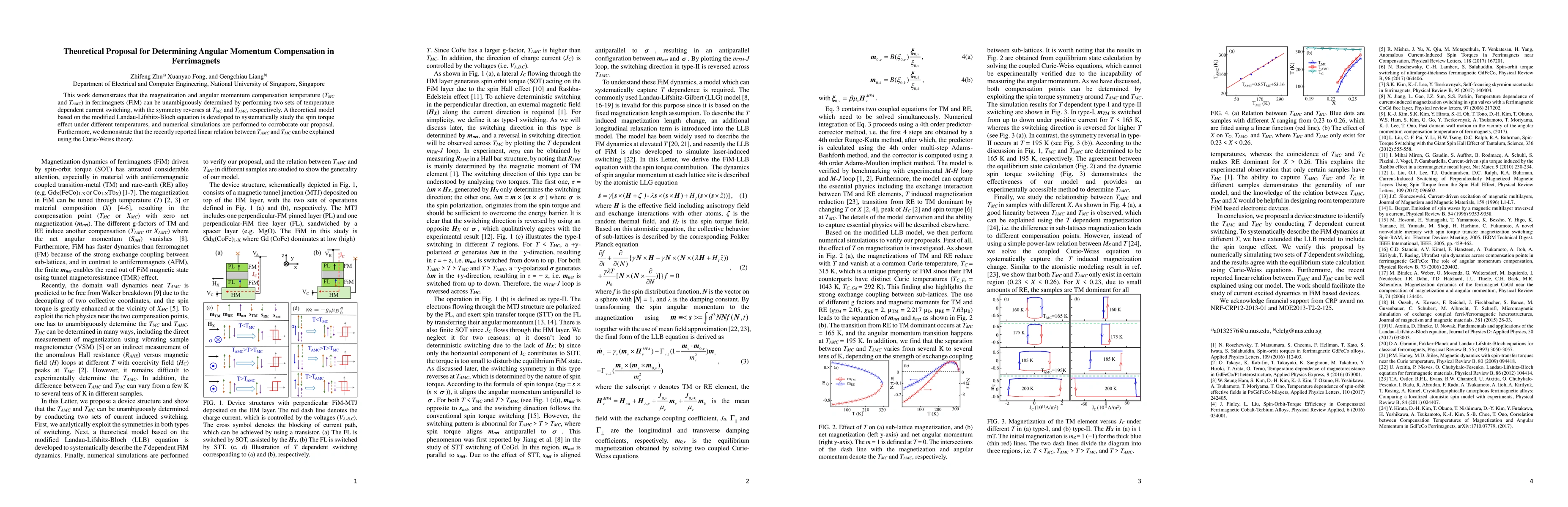 This paper proposes a theoretical method to determine magnetization and angular momentum compensation temperatures in ferrimagnets through temperature-dependent current switching, supported by a modified Landau-Lifshitz-Bloch equation model and numerical simulations. It also explains the linear relation between these temperatures using the Curie-Weiss theory.