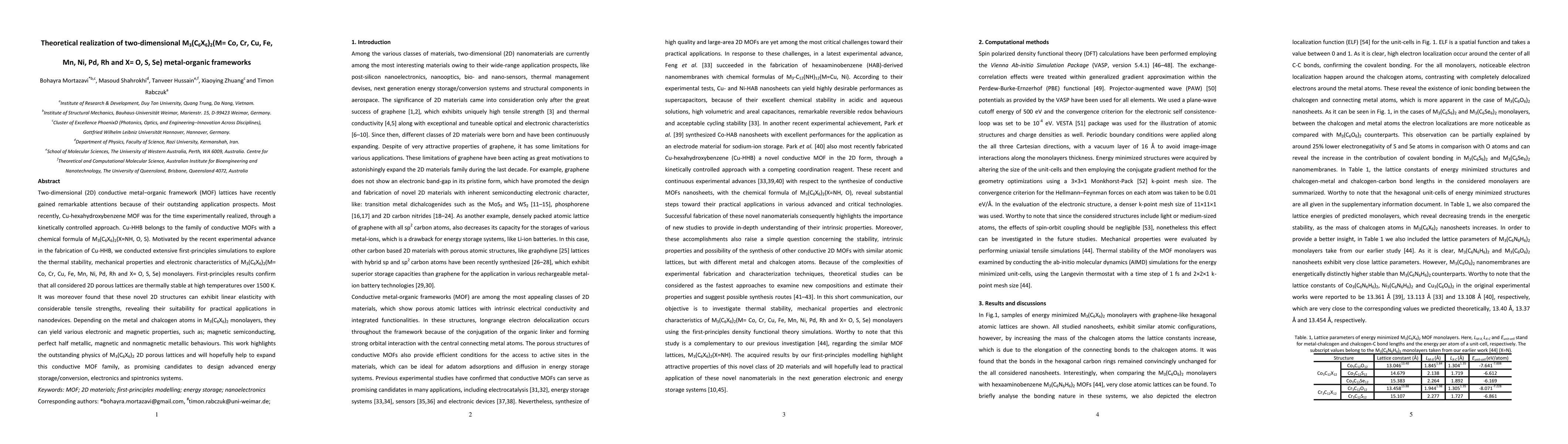 This paper presents first-principles simulations exploring the thermal stability, mechanical properties, and electronic characteristics of two-dimensional M3(C6X6)2 metal-organic frameworks. Results indicate high thermal stability, linear elasticity, and diverse electronic behaviors depending on metal and chalcogen composition, suggesting potential applications in nanodevices, energy storage, and spintronics.