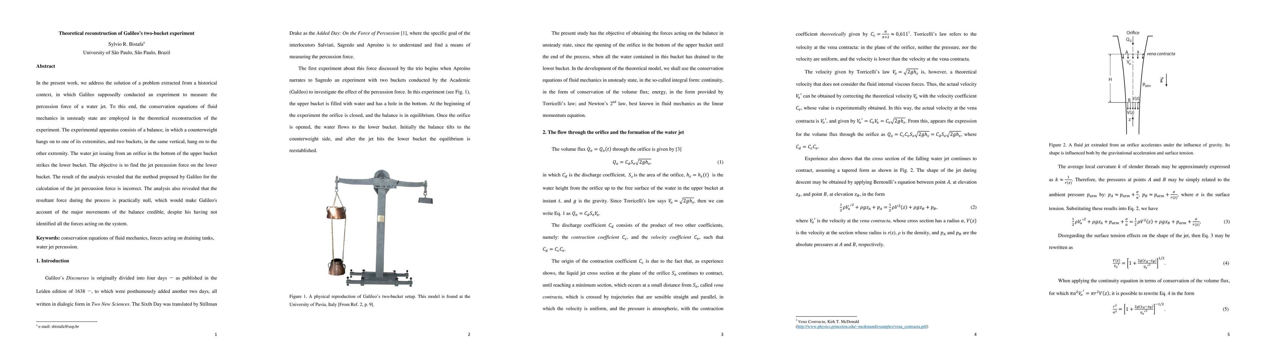 In the present work, we address the solution of a problem extracted from a historical context, in which Galileo supposedly conducted an experiment to measure the percussion force of a water jet. To this end, the conservation equations of fluid mechanics in unsteady state are employed in the theoretical reconstruction of the experiment. The experimental apparatus consists of a balance, in which a counterweight hangs on to one of its extremities, and two buckets, in the same vertical, hang on to the other extremity. The water jet issuing from an orifice in the bottom of the upper bucket strikes the lower bucket. The objective is to find the jet percussion force on the lower bucket. The result of the analysis revealed that the method proposed by Galileo for the calculation of the jet percussion force is incorrect. The analysis also revealed that the resultant force during the process is practically null, which would make Galileo's account of the major movements of the balance credible, despite his having not identified all the forces acting on the system.