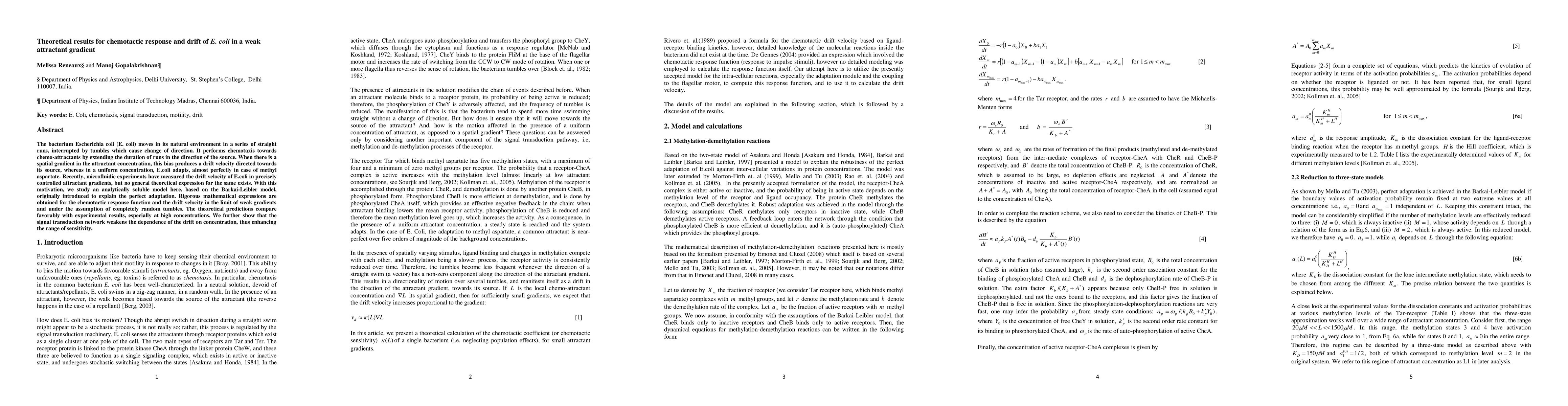 This paper develops a theoretical framework based on the Barkai-Leibler model to analyze the chemotactic response and drift of E. coli in weak attractant gradients. The study provides rigorous mathematical expressions for chemotactic response and drift velocity, which align well with experimental data, particularly at high concentrations.