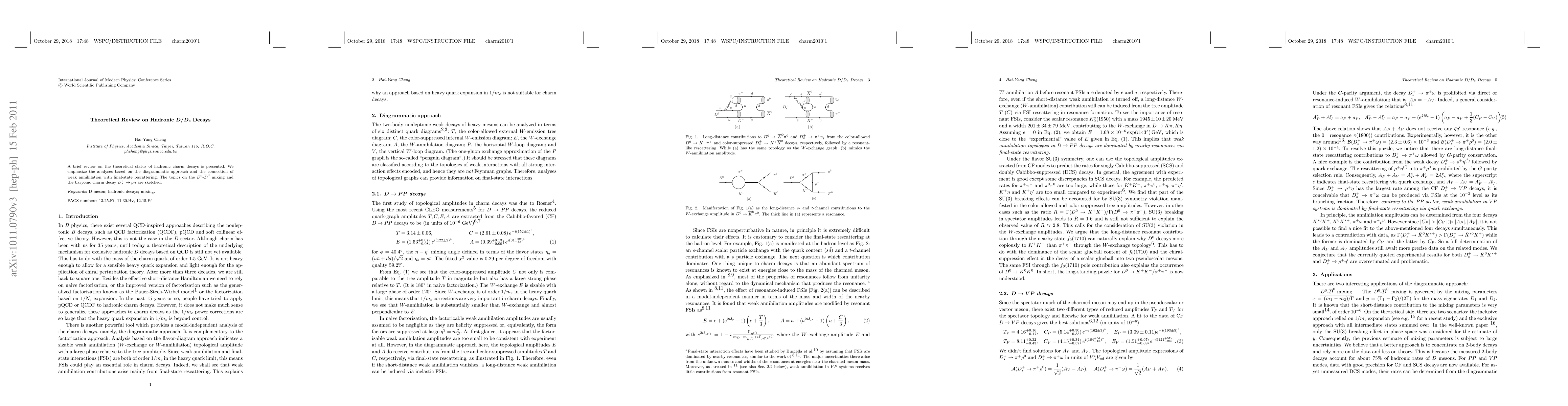 This paper reviews theoretical frameworks for hadronic charm decays, focusing on diagrammatic approaches and the interplay between weak annihilation and final-state rescattering, with particular attention on $D^0$-$\bar D^0$ mixing and the baryonic decay $D_s^+\to p\bar n$.