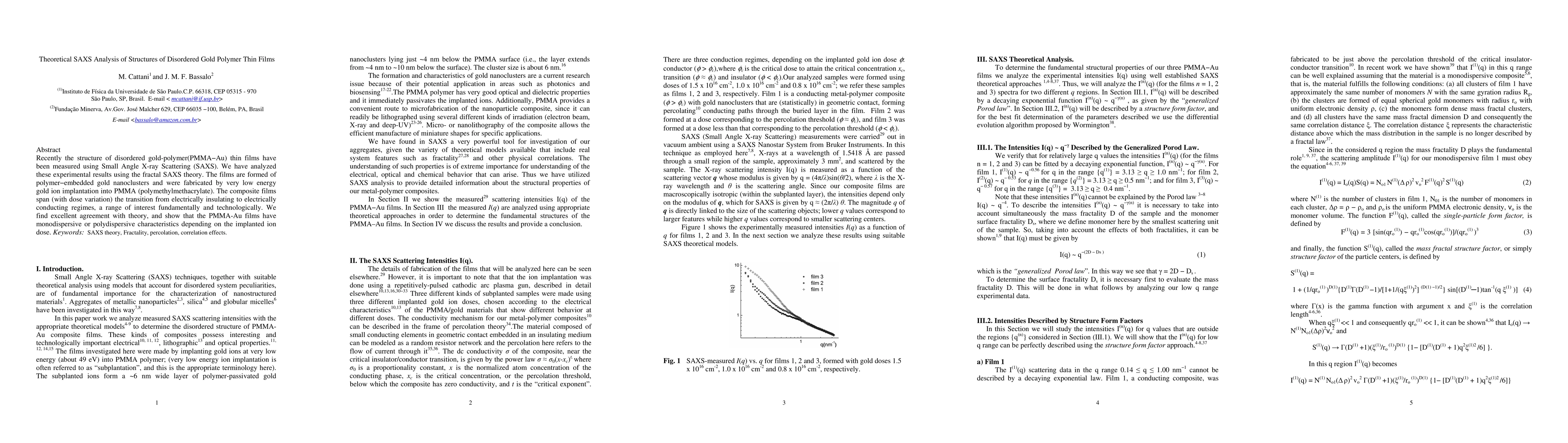 This paper analyzes the structure of disordered gold-polymer thin films using fractal SAXS theory, finding that the films exhibit monodispersive or polydispersive characteristics based on the gold ion implantation dose, with excellent agreement between experimental SAXS results and theoretical predictions. The study highlights the transition from insulating to conducting behavior in these composite films.