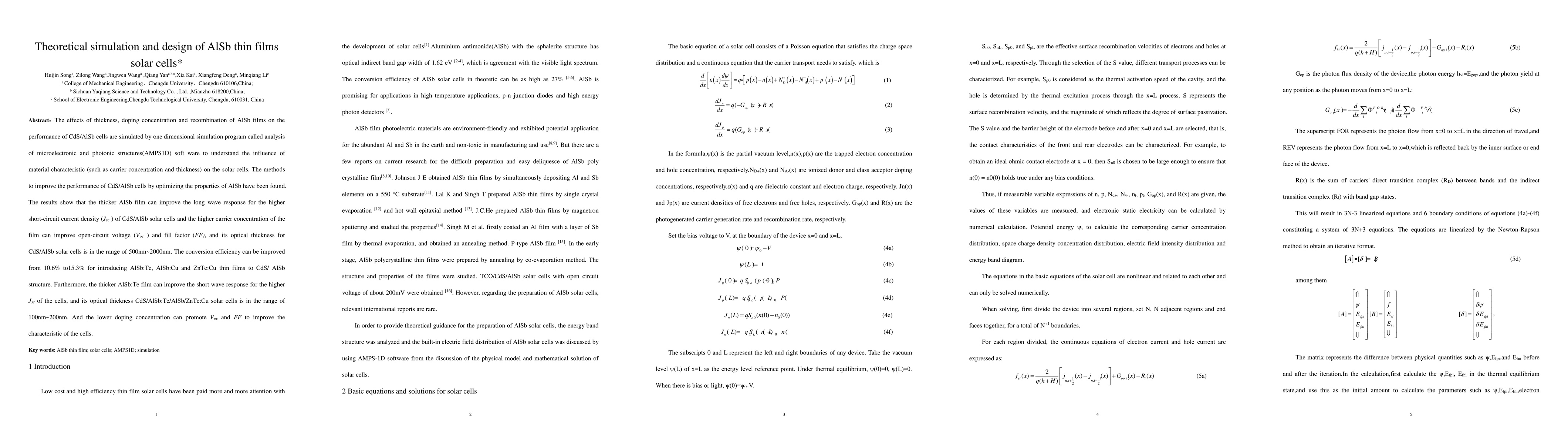 The effects of thickness, doping concentration and recombination of AlSb films on the performance of CdS/AlSb cells are simulated by one dimensional simulation program called analysis of microelectronic and photonic structures(AMPS1D) soft ware to understand the influence of material characteristic (such as carrier concentration and thickness) on the solar cells. The methods to improve the performance of CdS/AlSb cells by optimizing the properties of AlSb have been found. The results show that the thicker AlSb film can improve the long wave response for the higher short-circuit current density (Jsc ) of CdS/AlSb solar cells and the higher carrier concentration of the film can improve open-circuit voltage (Voc ) and fill factor (FF), and its optical thickness for CdS/AlSb solar cells is in the range of 500nm~2000nm. The conversion efficiency can be improved from 10.6% to15.3% for introducing AlSb:Te, AlSb:Cu and ZnTe:Cu thin films to CdS/ AlSb structure. Furthermore, the thicker AlSb:Te film can improve the short wave response for the higher Jsc of the cells, and its optical thickness CdS/AlSb:Te/AlSb/ZnTe:Cu solar cells is in the range of 100nm~200nm. And the lower doping concentration can promote Voc and FF to improve the characteristic of the cells.