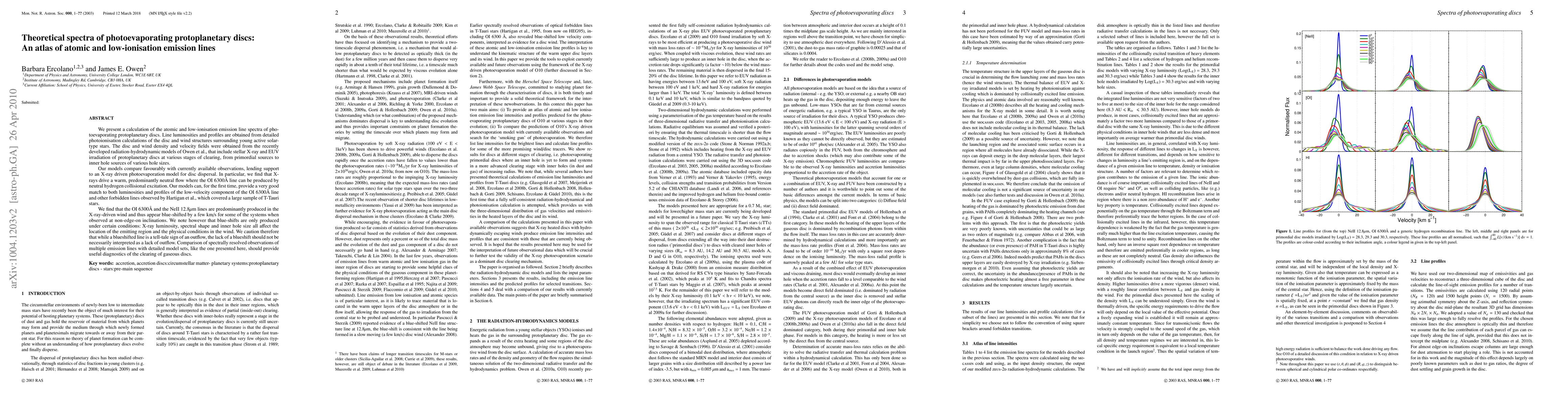 This paper provides detailed theoretical spectra of atomic and low-ionisation emission lines in photoevaporating protoplanetary discs, showing good agreement with observations. The study supports an X-ray driven photoevaporation model, highlighting the OI 6300A line's production in neutral hydrogen and the blue-shifted appearance of certain lines under specific conditions.