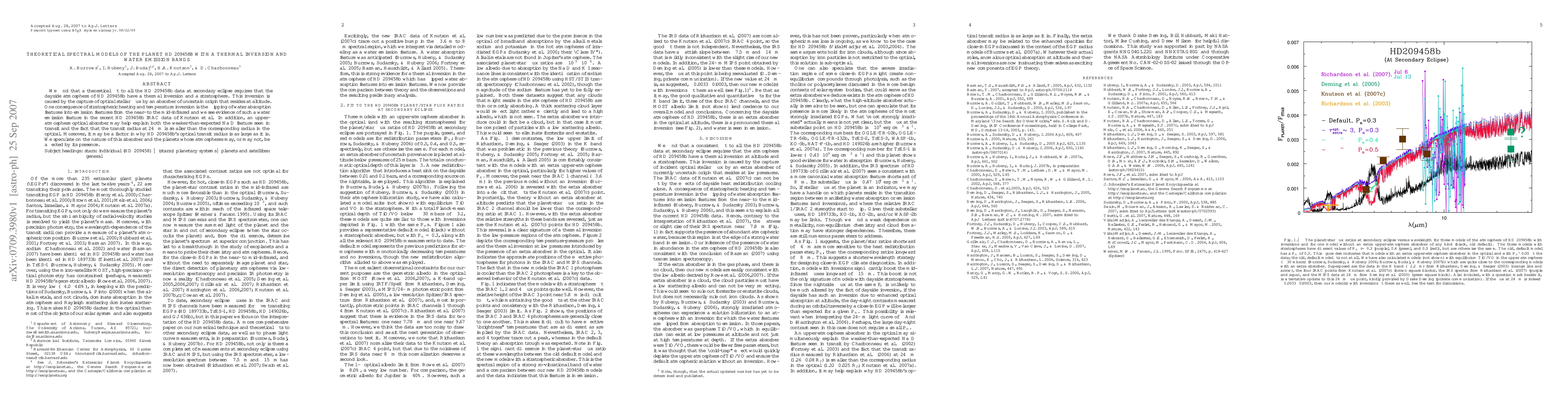 We find that a theoretical fit to all the HD 209458b data at secondary eclipse requires that the dayside atmosphere of HD 209458b have a thermal inversion and a stratosphere. This inversion is caused by the capture of optical stellar flux by an absorber of uncertain origin that resides at altitude. One consequence of stratospheric heating and temperature inversion is the flipping of water absorption features into emission features from the near- to the mid-infrared and we see evidence of such a water emission feature in the recent HD 209458b IRAC data of Knutson et al. In addition, an upper-atmosphere optical absorber may help explain both the weaker-than-expected Na D feature seen in transit and the fact that the transit radius at 24 $\mu$m is smaller than the corresponding radius in the optical. Moreover, it may be a factor in why HD 209458b's optical transit radius is as large as it is. We speculate on the nature of this absorber and the planets whose atmospheres may, or may not, be affected by its presence.