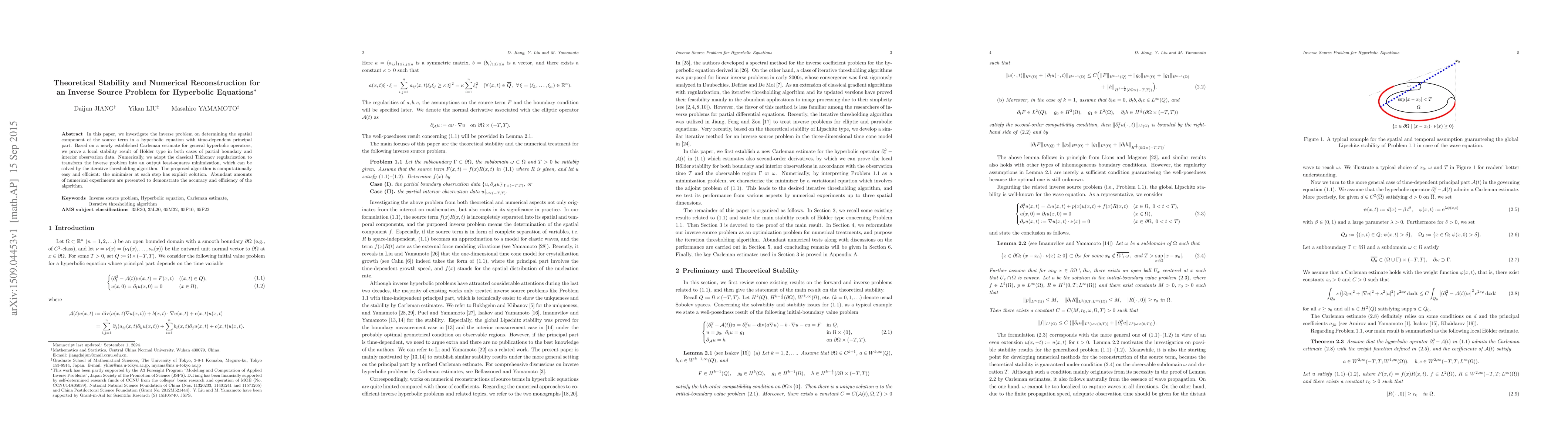 This paper investigates the inverse problem of determining the spatial component of a source term in hyperbolic equations using a new Carleman estimate, proving local H\"older stability. It employs Tikhonov regularization and an iterative thresholding algorithm for numerical reconstruction, demonstrating accuracy and efficiency through extensive experiments.