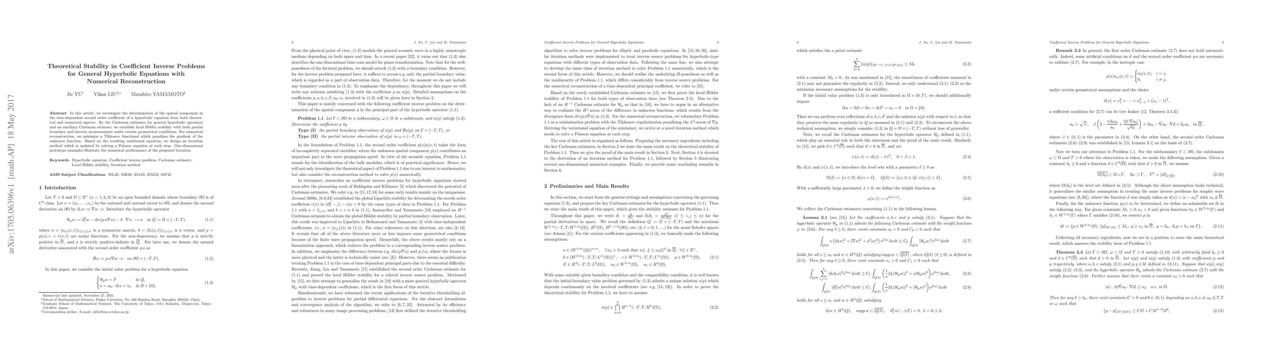 This paper establishes theoretical local Hölder stability for determining the spatial component in the coefficient of general hyperbolic equations using Carleman estimates and auxiliary estimates. It also proposes a numerical reconstruction method based on minimizing a Tikhonov functional and an iterative scheme that updates via solving a Poisson equation, validated through one-dimensional examples.