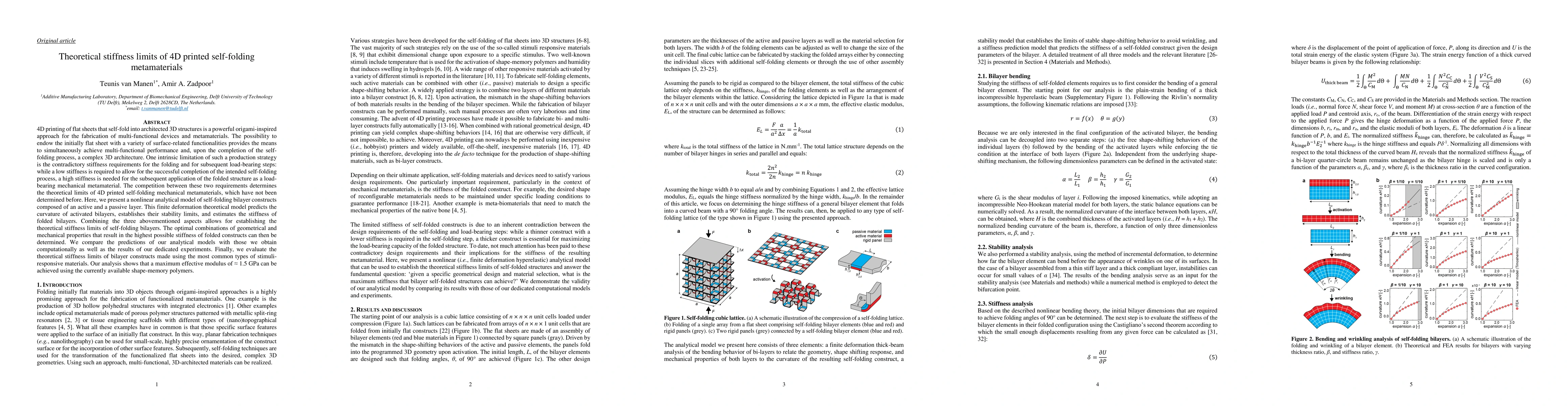 4D printing of flat sheets that self-fold into architected 3D structures is a powerful origami-inspired approach for the fabrication of multi-functional devices and metamaterials. The possibility to endow the initially flat sheet with a variety of surface-related functionalities provides the means to simultaneously achieve multi-functional performance and a complex 3D architecture. One intrinsic limitation of such a production strategy is the contradictory stiffness requirements for the folding and for subsequent load-bearing steps: while a low stiffness is required to allow for the successful completion of the intended self-folding process, a high stiffness is needed for the subsequent application of the folded structure as a load-bearing mechanical metamaterial. The competition between these two requirements determines the theoretical limits of 4D printed self-folding mechanical metamaterials, which have not been determined before. Here, we present a nonlinear analytical model of self-folding bilayer constructs composed of an active and a passive layer. This finite deformation theoretical model predicts the curvature of activated bilayers, establishes their stability limits, and estimates the stiffness of folded bilayers. Combining the three abovementioned aspects allows for establishing the theoretical stiffness limits of self-folding bilayers. The optimal combinations of geometrical and mechanical properties that result in the highest possible stiffness of folded constructs can then be determined. We compare the predictions of our analytical models with computational as well as experimental results. Finally, we evaluate the theoretical stiffness limits of bilayer constructs made using the most common types of stimuli-responsive materials. Our analysis shows that a maximum effective modulus of ~1.5 GPa can be achieved using the currently available shape-memory polymers.