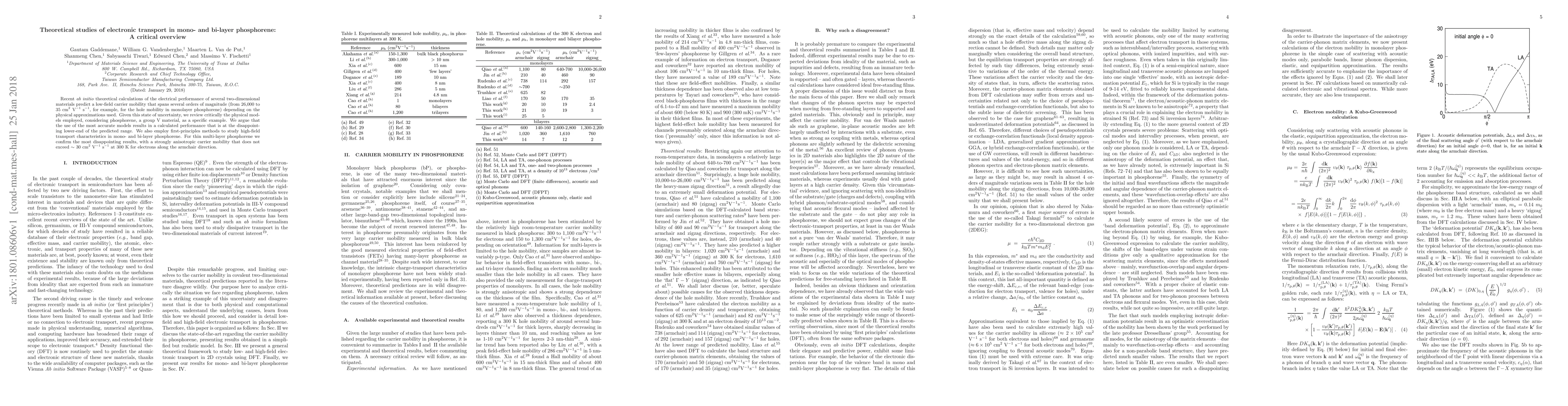 Recent $\textit{ab initio}$ theoretical calculations of the electrical performance of several two-dimensional materials predict a low-field carrier mobility that spans several orders of magnitude (from 26,000 to 35 cm$^{2}$ V$^{-1}$ s$^{-1}$, for example, for the hole mobility in monolayer phosphorene) depending on the physical approximations used. Given this state of uncertainty, we review critically the physical models employed, considering phosphorene, a group V material, as a specific example. We argue that the use of the most accurate models results in a calculated performance that is at the disappointing lower-end of the predicted range. We also employ first-principles methods to study high-field transport characteristics in mono- and bi-layer phosphorene. For thin multi-layer phosphorene we confirm the most disappointing results, with a strongly anisotropic carrier mobility that does not exceed $\sim$ 30 cm$^{2}$ V$^{-1}$ s$^{-1}$ at 300 K for electrons along the armchair direction.