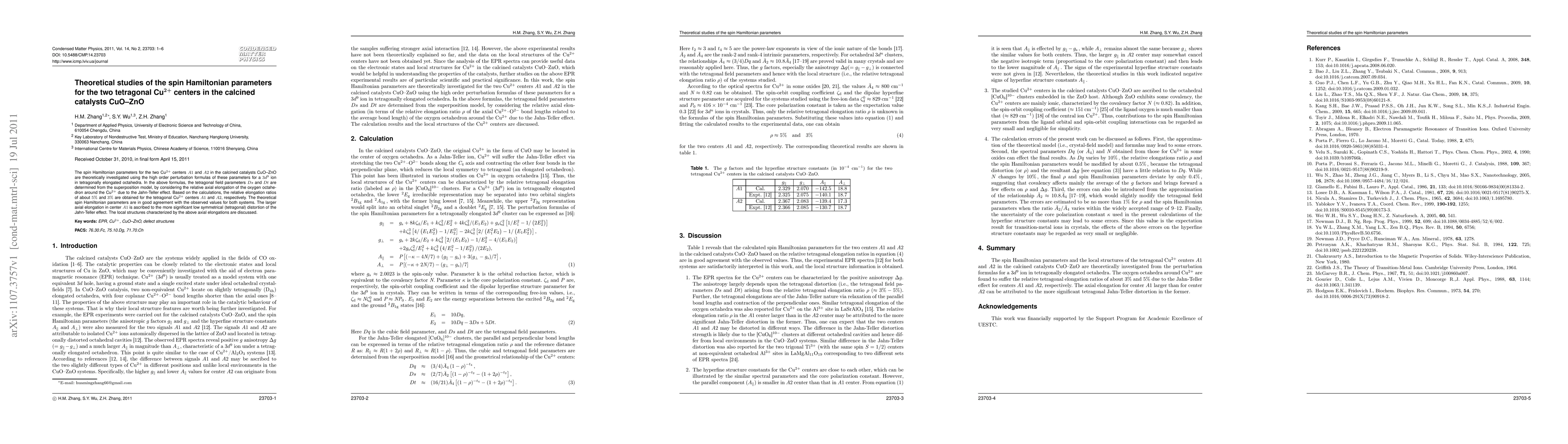 The spin Hamiltonian parameters for the two Cu$^{2+}$ centers $A1$ and $A2$ in the calcined catalysts CuO-ZnO are theoretically investigated using the high order perturbation formulas of these parameters for a $3d^{9}$ ion in tetragonally elongated octahedra. In the above formulas, the tetragonal field parameters $Ds$ and $Dt$ are determined from the superposition model, by considering the relative axial elongation of the oxygen octahedron around the Cu$^{2+}$ due to the Jahn-Teller effect. Based on the calculations, the relative elongation ratios of about 5% and 3% are obtained for the tetragonal Cu$^{2+}$ centers $A1$ and $A2$, respectively. The theoretical spin Hamiltonian parameters are in good agreement with the observed values for both systems. The larger axial elongation in center $A1$ is ascribed to the more significant low symmetrical (tetragonal) distortion of the Jahn-Teller effect. The local structures characterized by the above axial elongations are discussed.