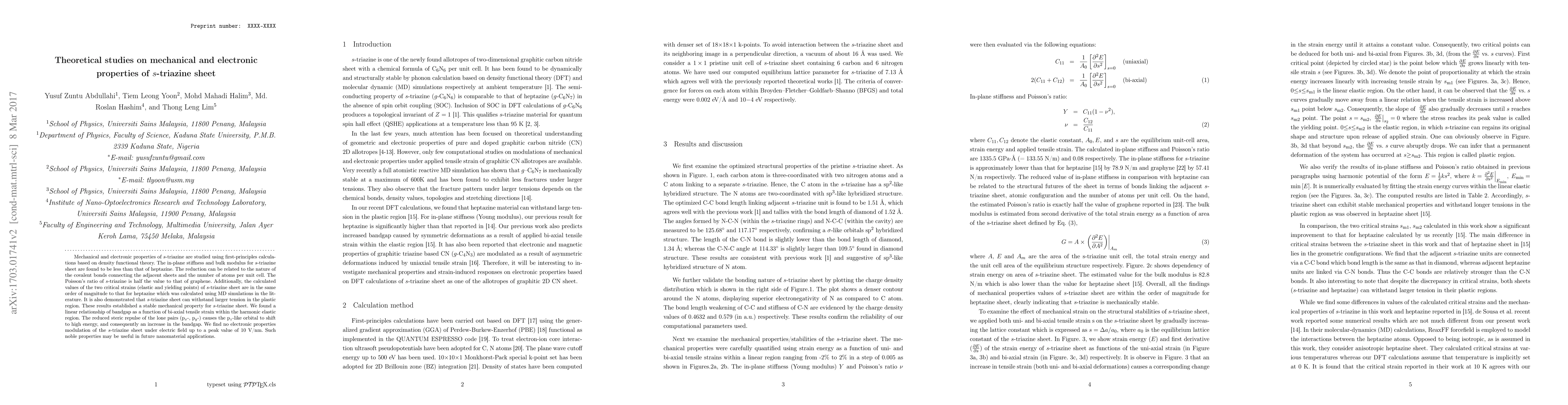 Researchers used first-principles calculations to study the mechanical and electronic properties of s-triazine sheet, finding it has a stable structure with potential applications in nanomaterials.