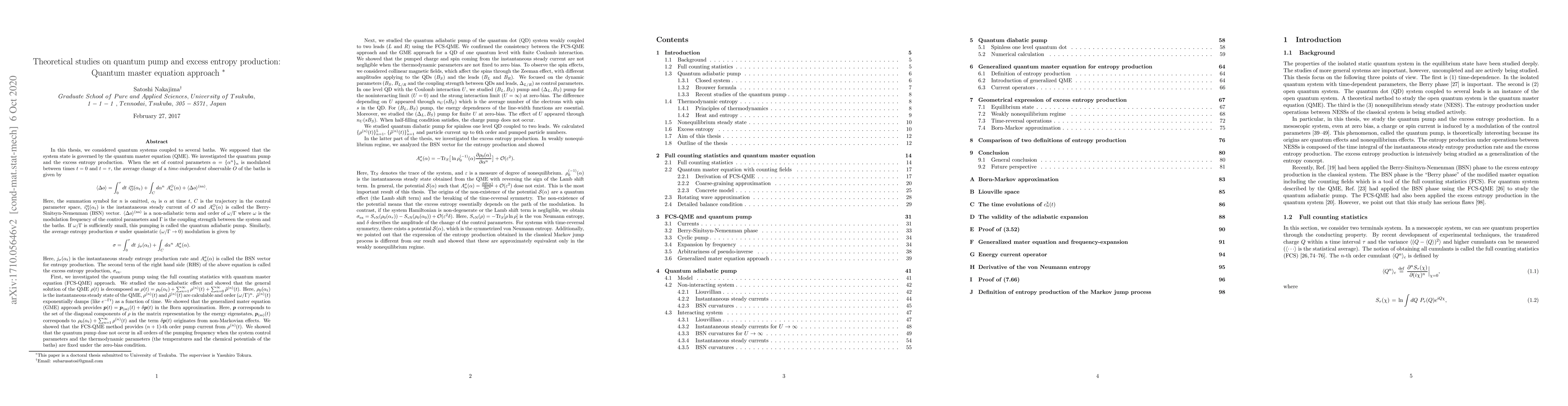 In this thesis, we considered quantum systems coupled to several baths. We supposed that the system state is governed by the quantum master equation (QME). We investigated the quantum pump and the excess entropy production. In the first half of the thesis, we investigated the quantum pump using the full counting statistics with quantum master equation (FCS-QME) approach. In the latter part of the thesis, we investigated the excess entropy production. The average entropy production is composed of the time integral of the instantaneous steady entropy production rate and the excess entropy production. We define average entropy production rate using the average energy and particle currents, which are calculated by using the full counting statistics with QME. The excess entropy production is given by a line integral in the control parameter space and its integrand is called the Berry-Sinitsyn-Nemenman (BSN) vector. In the weakly nonequilibrium regime, we show that BSN vector is described by $\ln \rho_0^{(-1)}$ and $\rho_0$ where $\rho_0$ is the instantaneous steady state of the QME and $\rho_0^{(-1)}$ is that of the QME which is given by reversing the sign of the Lamb shift term. In general, the potential dose not exist. The origins of the non-existence of the potential are a quantum effect (the Lamb shift) and the breaking of the time-reversal symmetry. The non-existence of the potential means that the excess entropy essentially depends on the path of the modulation. If the system Hamiltonian is non-degenerate or the Lamb shift term is negligible, the excess entropy production approximately reduces to the difference between the von Neumann entropies of the system. We pointed out that the expression of the entropy production obtained in the classical Markov jump process is different from our result and showed that these are approximately equivalent only in the weakly nonequilibrium regime.