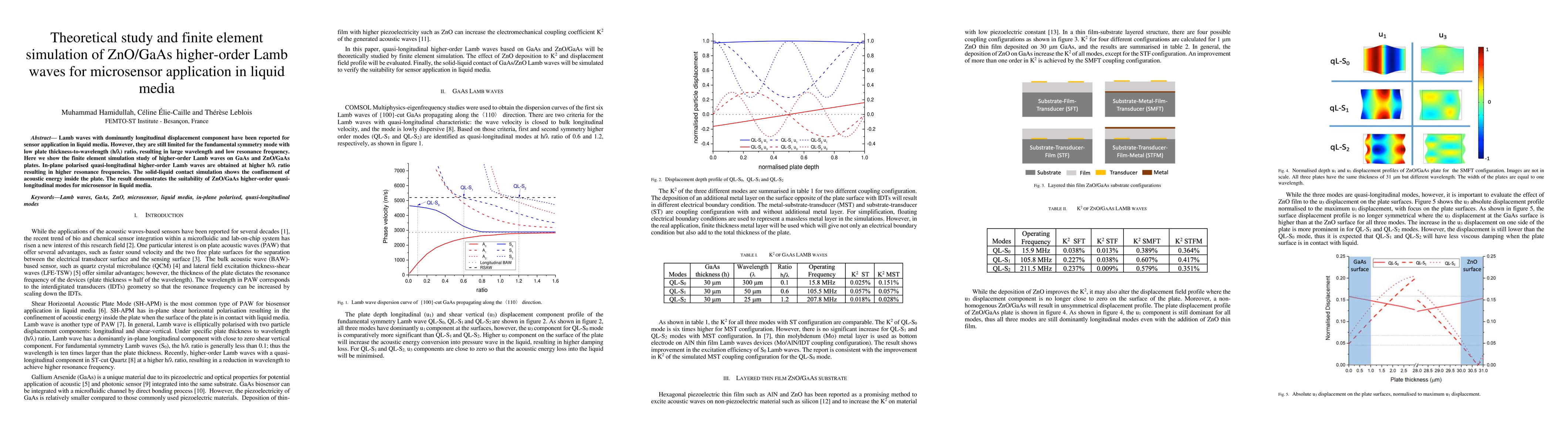 Lamb waves with dominantly longitudinal displacement component have been reported for sensor application in liquid media. However, they are still limited for the fundamental symmetry mode with low plate thickness-to-wavelength (h/l) ratio, resulting in large wavelength and low resonance frequency. Here we show the finite element simulation study of higher-order Lamb waves on GaAs and ZnO/GaAs plates. In-plane polarised quasi-longitudinal higher-order Lamb waves are obtained at higher h/l ratio resulting in higher resonance frequencies. The solid-liquid contact simulation shows the confinement of acoustic energy inside the plate. The result demonstrates the suitability of ZnO/GaAs higher-order quasi-longitudinal modes for microsensor in liquid media.