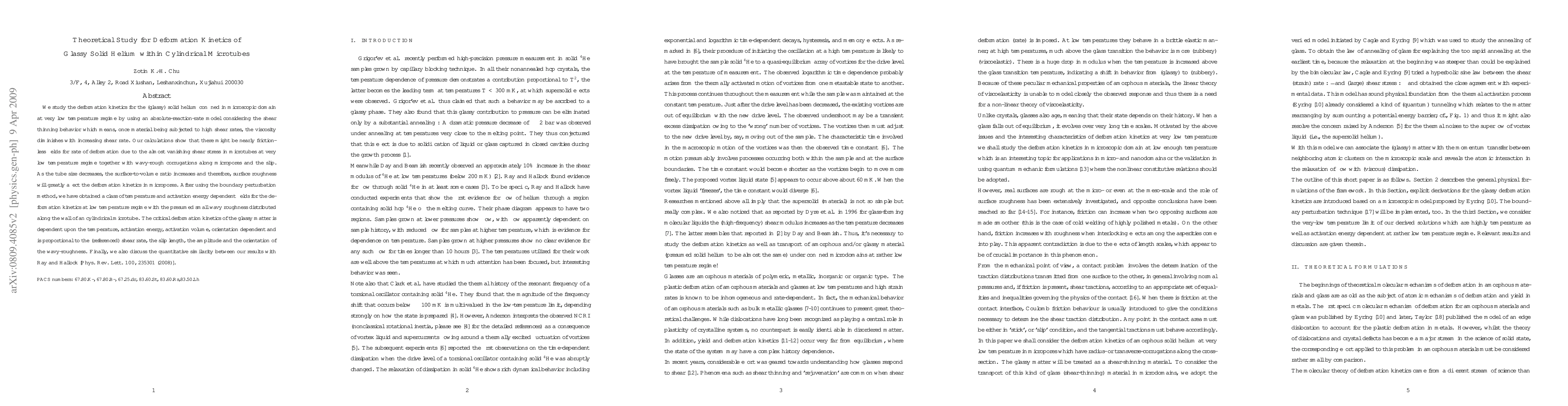 The deformation kinetics for glassy solid helium confined in microscopic domain at very low temperature regime was investigated using a transition-rate model considering the shear thinning behavior which means, once material being subjected to high shear rates, the viscosity diminishes with increasing shear rate. The preliminary results show that there might be nearly frictionless fields for rate of deformation due to the almost vanishing shear stress in microtubes at very low temperature regime subjected to some surface conditions : The relatively larger roughness (compared to the macroscopic domain) inside microtubes and the slip. As the pore size decreases, the surface-to-volume ratio increases and therefore, surface roughness will greatly affect the deformation kinetics in microtubes. By using the boundary perturbation method, we obtained a class of temperature and activation energy dependent fields for the deformation kinetics at low temperature regime with the presumed small wavy roughness distributed along the walls of an cylindrical microtube. The critical deformation kinetics of the glassy matter is dependent upon the temperature, activation energy, activation volume, orientation dependent and is proportional to the (referenced) shear rate, the slip length, the amplitude and the orientation of the wavy-roughness. Finally, we also discuss the quantitative similarity between our results with Ray and Hallock [Phys. Rev. Lett. {\bf 100}, 235301 (2008)].