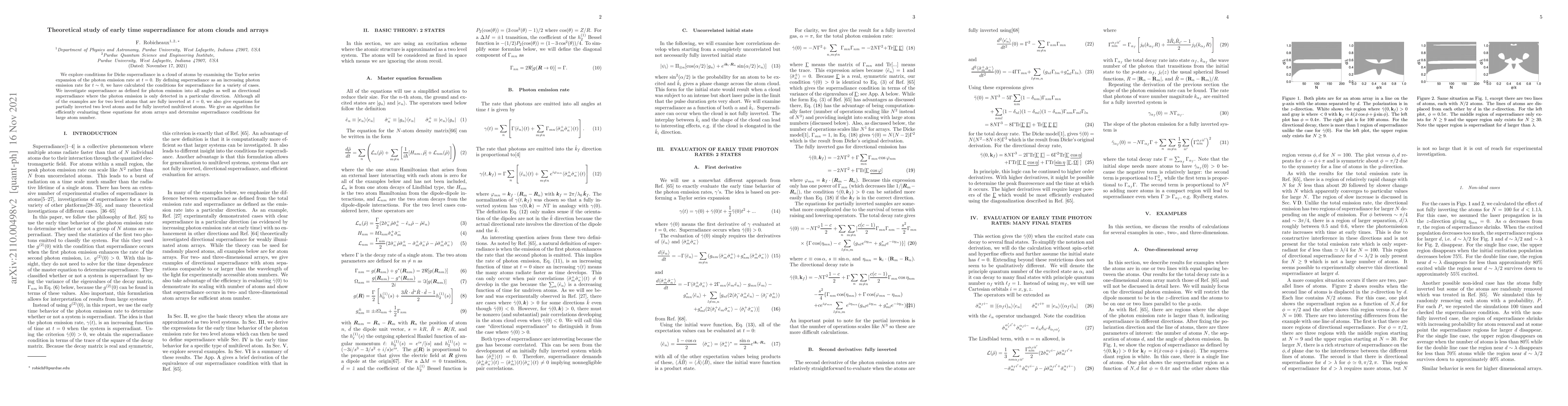 This paper investigates the conditions for early time superradiance in atom clouds and arrays, focusing on the photon emission rate at $t=0$. It provides an algorithm for evaluating superradiance conditions for large atom numbers and explores both isotropic and directional superradiance for various atom configurations.