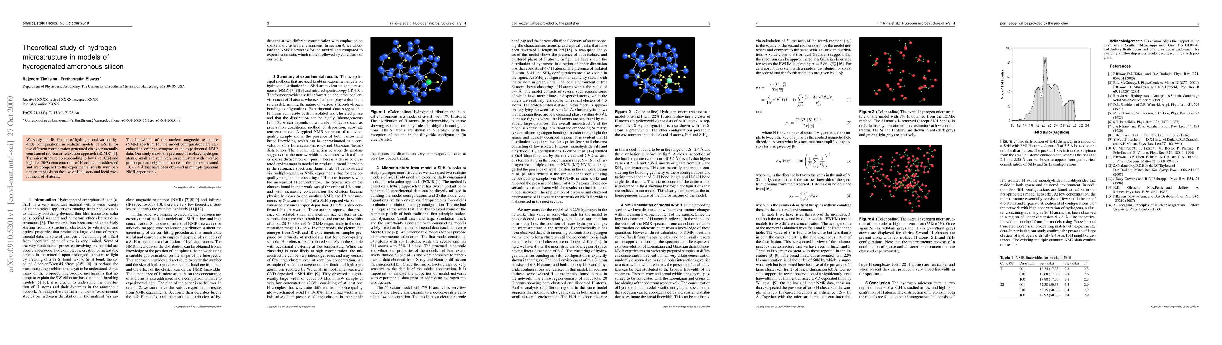 We study the distribution of hydrogen and various hydride configurations in realistic models of a-Si:H for two different concentration generated via experimentally constrained molecular relaxation approach (ECMR) [1]. The microstructure corresponding to low (< 10%) and high (> 20%) concentration of H atoms are addressed and are compared to the experimental results with particular emphasis on the size of H clusters and local environment of H atoms.The linewidths of the nuclear magnetic resonance (NMR) spectrum for the model configurations are calculated in order to compare to the experimental NMR data. Our study shows the presence of isolated hydrogen atoms, small and relatively large clusters with average proton-proton neighbor distance in the clusters around 1.6 to 2.4 Angstrom that have been observed in multiple quantum NMR experiments.