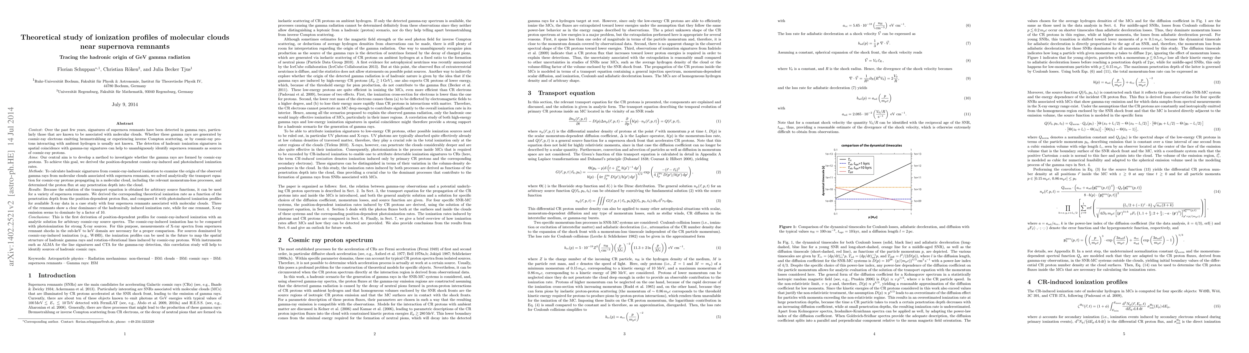 This study analytically solves the transport equation for cosmic ray protons in molecular clouds to determine ionization profiles, aiming to identify the hadronic origin of GeV gamma rays from supernova remnants. The results show that three out of four studied remnants exhibit dominant hadronic ionization, suggesting these sources are significant for mapping cosmic ray protons.