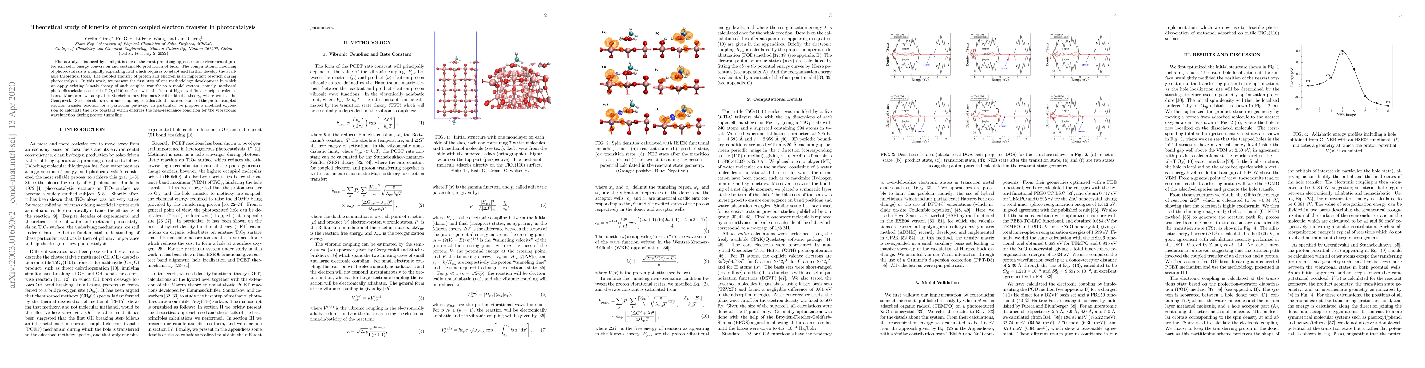 Photocatalysis induced by sunlight is one of the most promising approach to environmental protection, solar energy conversion and sustainable production of fuels. The computational modeling of photocatalysis is a rapidly expending field which requires to adapt and further develop the available theoretical tools. The coupled transfer of proton and electron is an important reaction during photocatalysis. In this work, we present the first step of our methodology development in which we apply existing kinetic theory of such coupled transfer to a model system, namely, methanol photo-dissociation on rutile TiO$_2$(110) surface, with the help of high-level first-principles calculations. Moreover, we adapt the Stuchebrukhov-Hammes-Schiffer kinetic theory, where we use the Georgievskii-Stuchebrukhova vibronic coupling, to calculate the rate constant of the proton coupled electron transfer reaction for a particular pathway. In particular, we propose a modified expression to calculate the rate constant which enforces the near-resonance condition for the vibrational wavefunction during proton tunneling.