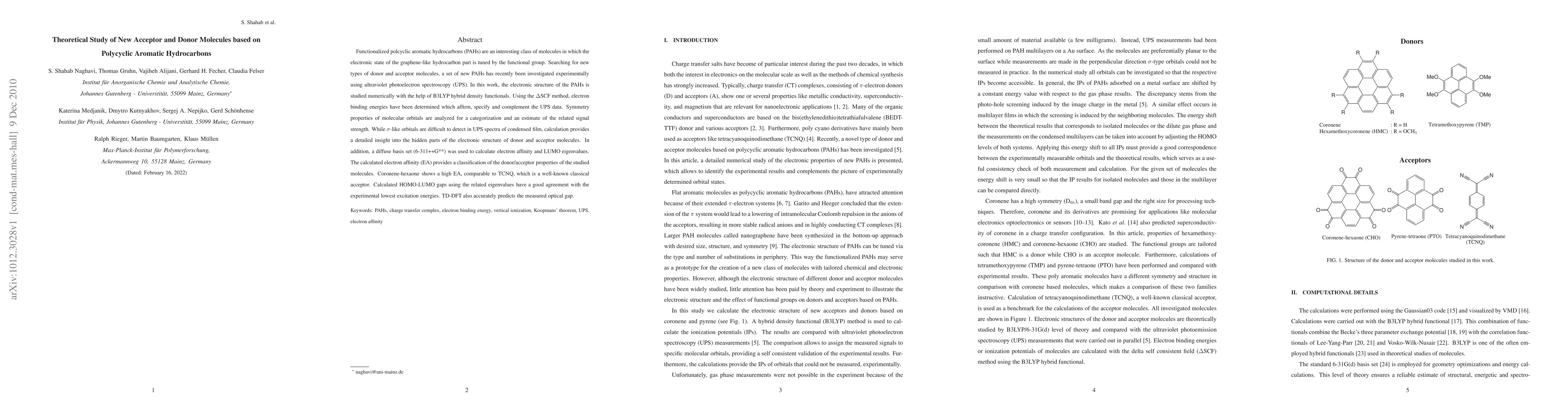 Researchers studied new donor and acceptor molecules based on polycyclic aromatic hydrocarbons (PAHs) using computational methods, finding that some PAHs have high electron affinity values comparable to known classical acceptors.
