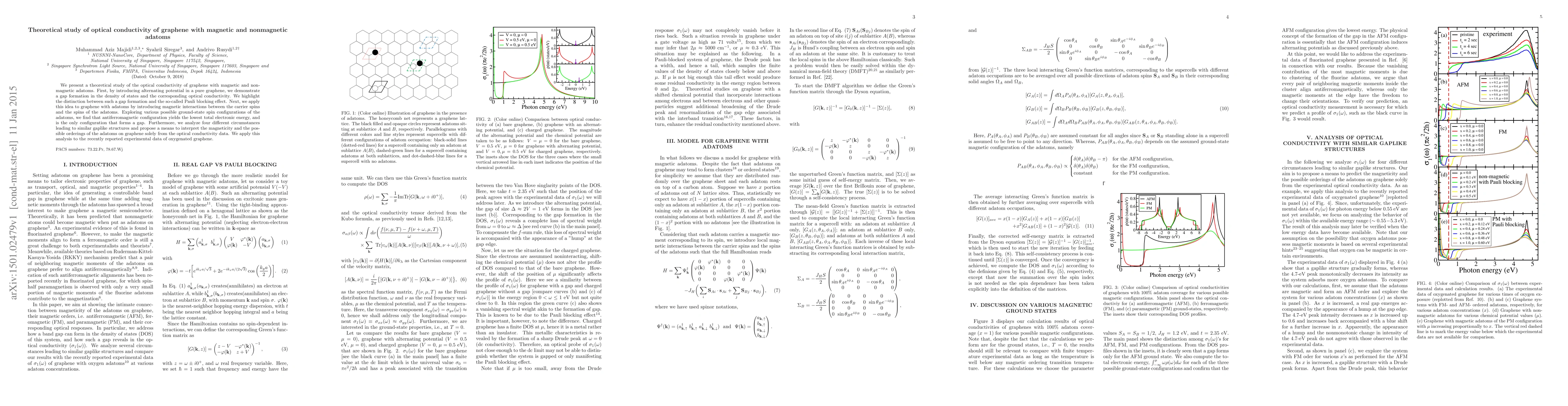 Researchers studied the optical conductivity of graphene with magnetic and nonmagnetic adatoms, finding that antiferromagnetic configurations can create gaps in the material's electronic energy spectrum.