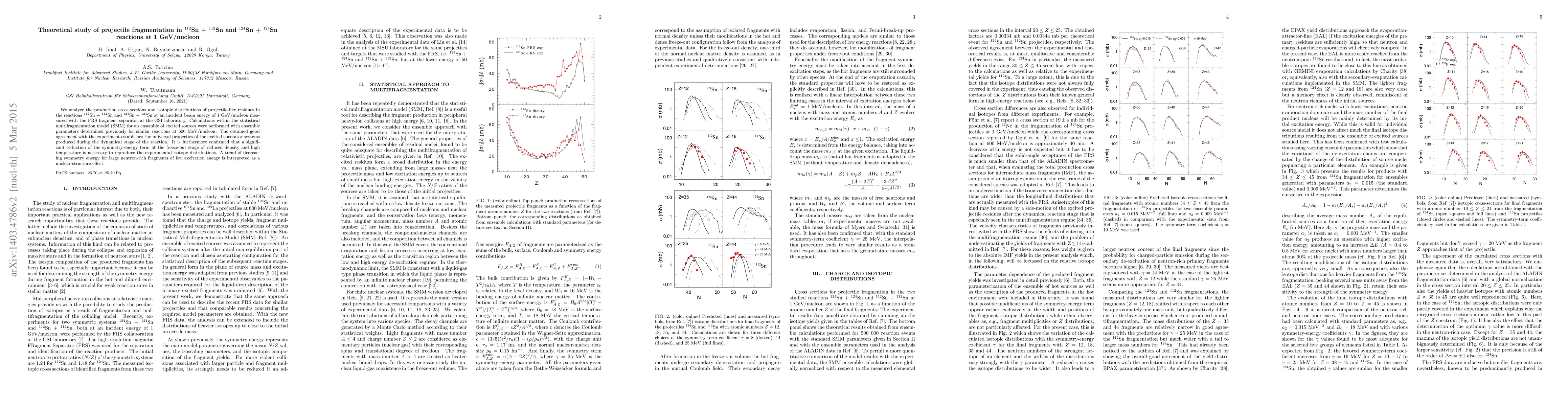 We analyze the production cross sections and isotopic distributions of projectile-like residues in the reactions $^{112}$Sn + $^{112}$Sn and $^{124}$Sn + $^{124}$Sn at an incident beam energy of 1 GeV/nucleon measured with the FRS fragment separator at the GSI laboratory. Calculations within the statistical multifragmentation model (SMM) for an ensemble of excited sources were performed with ensemble parameters determined previously for similar reactions at 600 MeV/nucleon. The obtained good agreement with the experiment establishes the universal properties of the excited spectator systems produced during the dynamical stage of the reaction. It is furthermore confirmed that a significant reduction of the symmetry-energy term at the freeze-out stage of reduced density and high temperature is necessary to reproduce the experimental isotope distributions. A trend of decreasing symmetry energy for large neutron-rich fragments of low excitation energy is interpreted as a nuclear-structure effect.