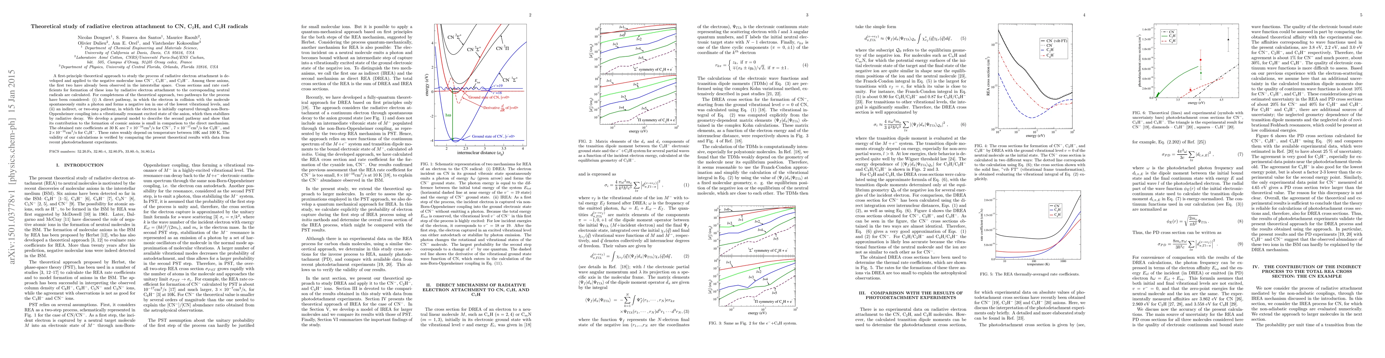 A first-principle theoretical approach to study the process of radiative electron attachment is developed and applied to the negative molecular ions CN$^-$, C$_4$H$^-$, and C$_2$H$^-$. Among these anions, the first two have already been observed in the interstellar space. Cross sections and rate coefficients for formation of these ions by radiative electron attachment to the corresponding neutral radicals are calculated. For completeness of the theoretical approach, two pathways for the process have been considered: (i) A direct pathway, in which the electron in collision with the molecule spontaneously emits a photon and forms a negative ion in one of the lowest vibrational levels, and (ii) an indirect, or two-step pathway, in which the electron is initially captured through non-Born-Oppenheimer coupling into a vibrationally resonant excited state of the anion, which then stabilizes by radiative decay. We develop a general model to describe the second pathway and show that its contribution to the formation of cosmic anions is small in comparison to the direct mechanism. The obtained rate coefficients at 30~K are $7\times 10^{-16}$cm$^3$/s for CN$^-$, $7\times 10^{-17}$cm$^3$/s for C$_2$H$^-$, and $2\times 10^{-16}$cm$^3$/s for C$_4$H$^-$. These rates weakly depend on temperature between 10K and 100 K. The validity of our calculations is verified by comparing the present theoretical results with data from recent photodetachment experiments.