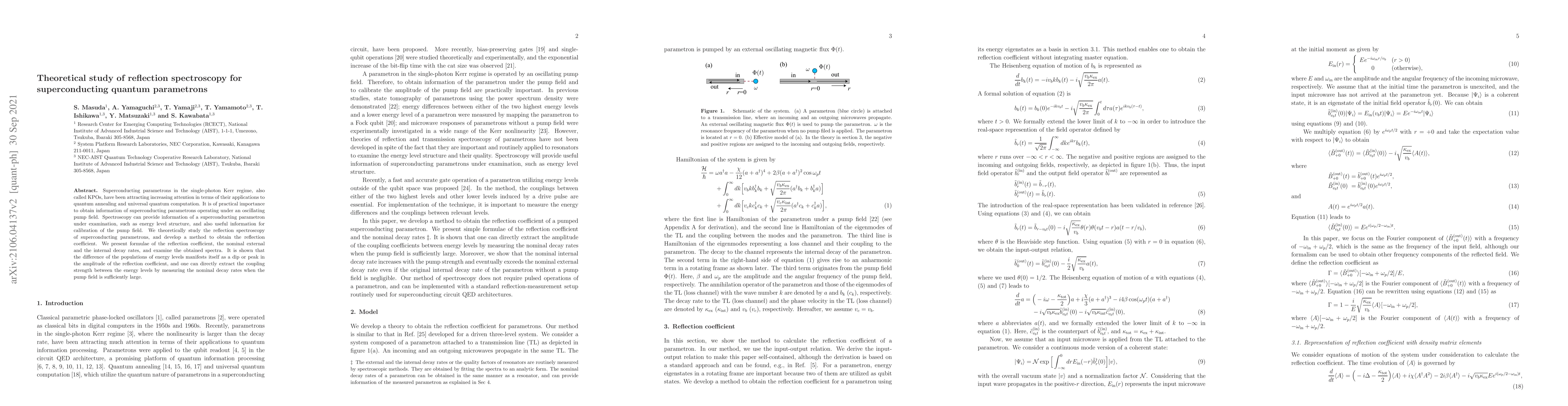 This paper theoretically investigates reflection spectroscopy for superconducting parametrons, developing methods to obtain the reflection coefficient and examining the resulting spectra. It demonstrates that differences in energy level populations manifest as dips or peaks in the reflection coefficient, allowing extraction of coupling strengths between levels.