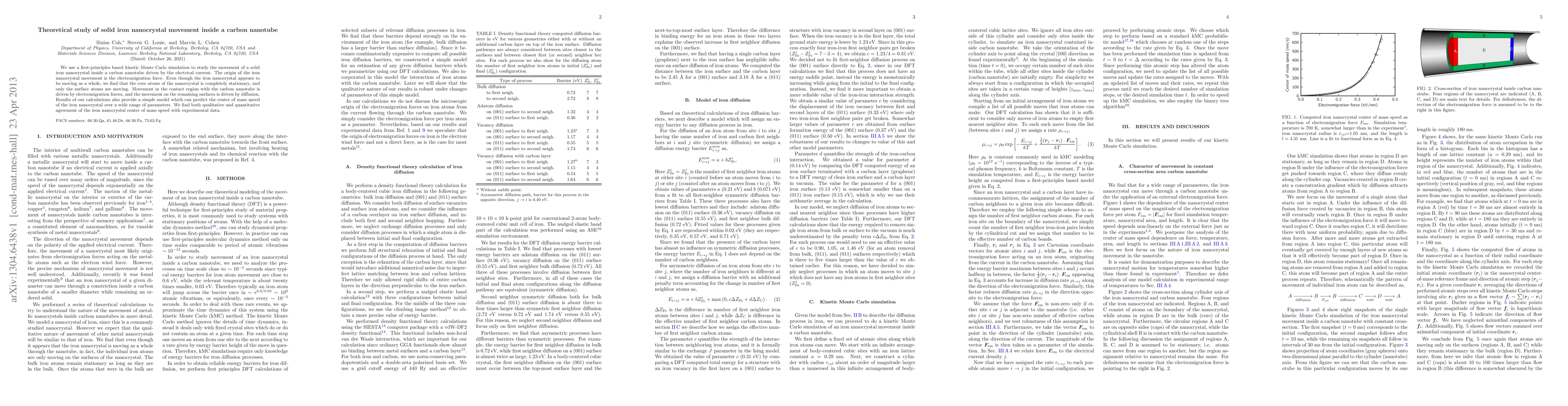 This study uses first-principles kinetic Monte Carlo simulations to investigate the electromigration-driven movement of solid iron nanocrystals inside carbon nanotubes. The research reveals that while the iron nanocrystal appears to move as a whole, only the surface atoms migrate, driven by electromigration and diffusion forces, with the core atoms remaining stationary.