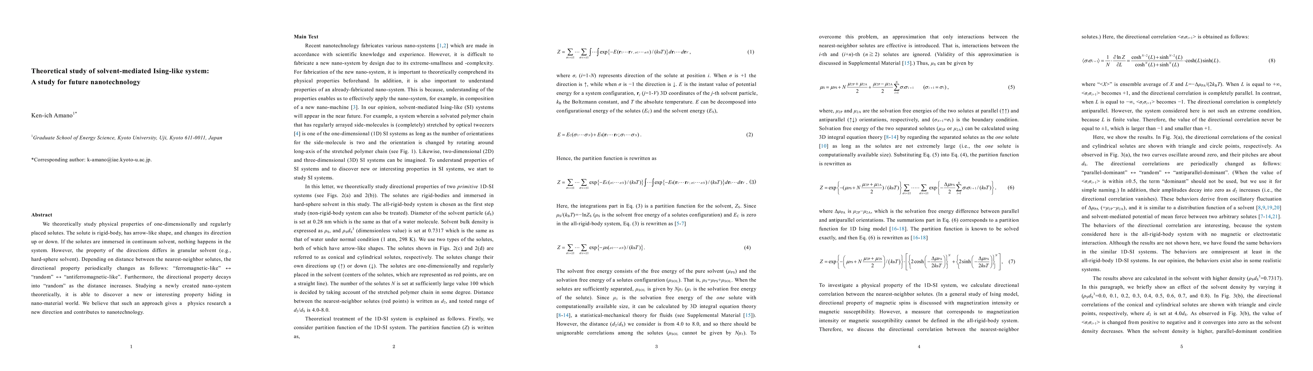 We theoretically study physical properties of one-dimensionally and regularly placed solutes. The solute is rigid-body, has arrow-like shape, and changes its direction up or down. If the solutes are immersed in continuum solvent, nothing happens in the system. However, the property of the directions differs in granular solvent (e.g., hard-sphere solvent). Depending on distance between the nearest-neighbor solutes, the directional property periodically changes as follows: "ferromagnetic-like" \leftrightarrow "random" \leftrightarrow "antiferromagnetic-like". Furthermore, the directional property decays into "random" as the distance increases. Studying a newly created nano-system theoretically, it is able to discover a new or interesting property hiding in nano-material world. We believe that such an approach gives physics research a new direction and contributes to nanotechnology.