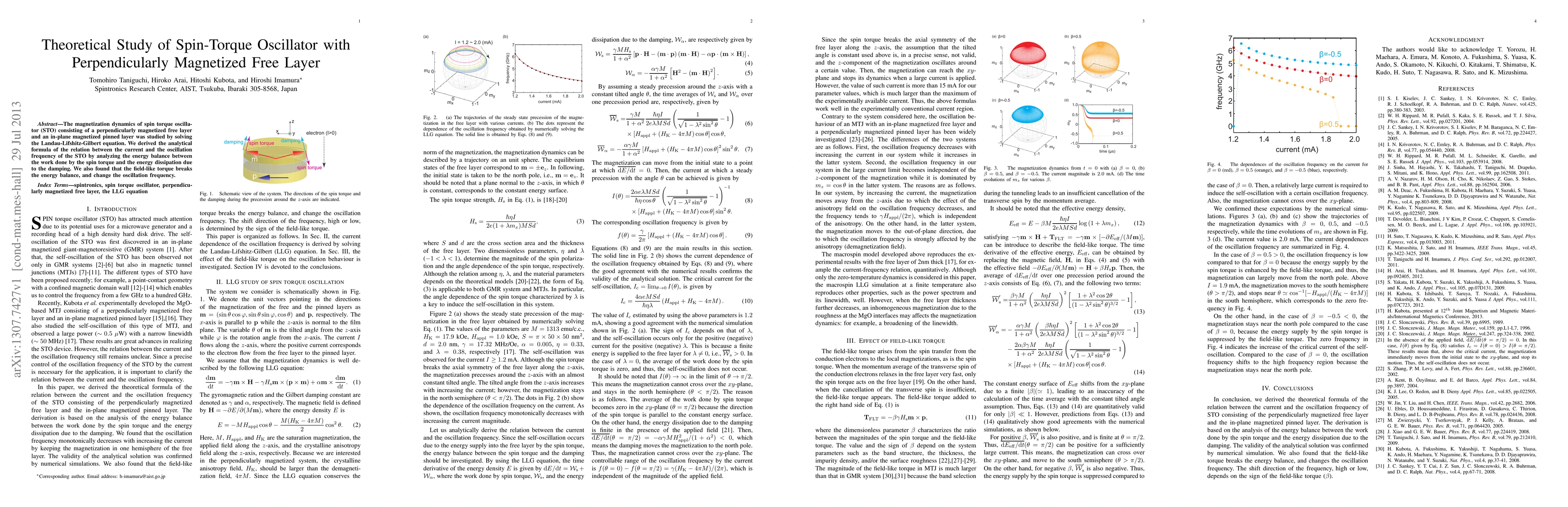 This paper investigates the magnetization dynamics of a spin-torque oscillator with a perpendicularly magnetized free layer using the Landau-Lifshitz-Gilbert equation. The study derives an analytical formula linking current to oscillation frequency and finds that the field-like torque alters the oscillation frequency by disrupting energy balance.