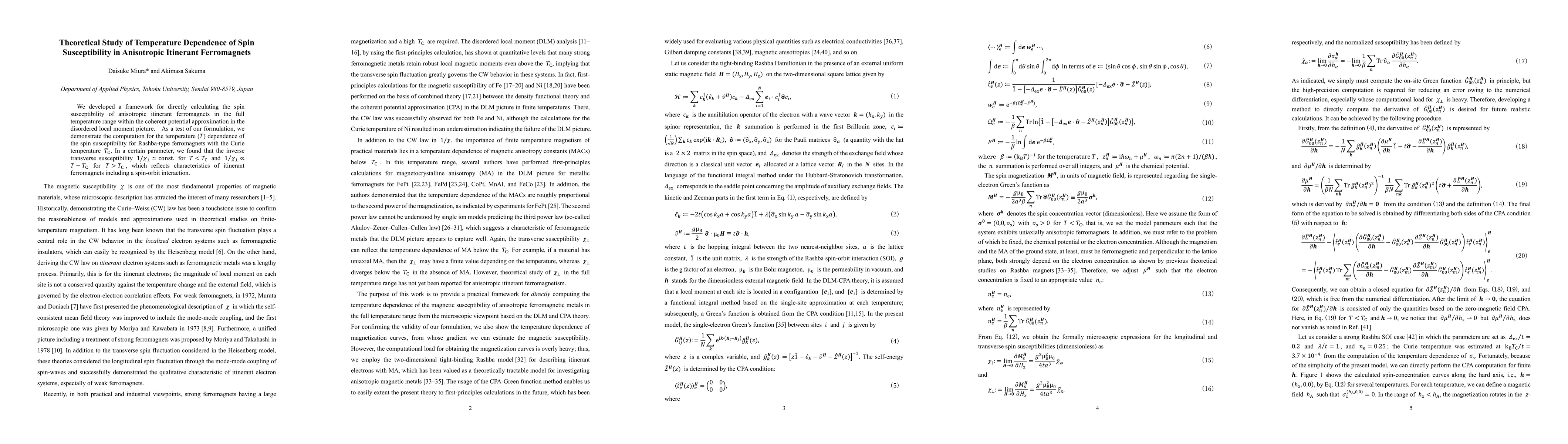 This paper presents a theoretical framework for calculating the temperature dependence of spin susceptibility in anisotropic itinerant ferromagnets using the coherent potential approximation. The study reveals distinct temperature-dependent behaviors in the inverse transverse susceptibility, highlighting the influence of spin-orbit interactions in Rashba-type ferromagnets.