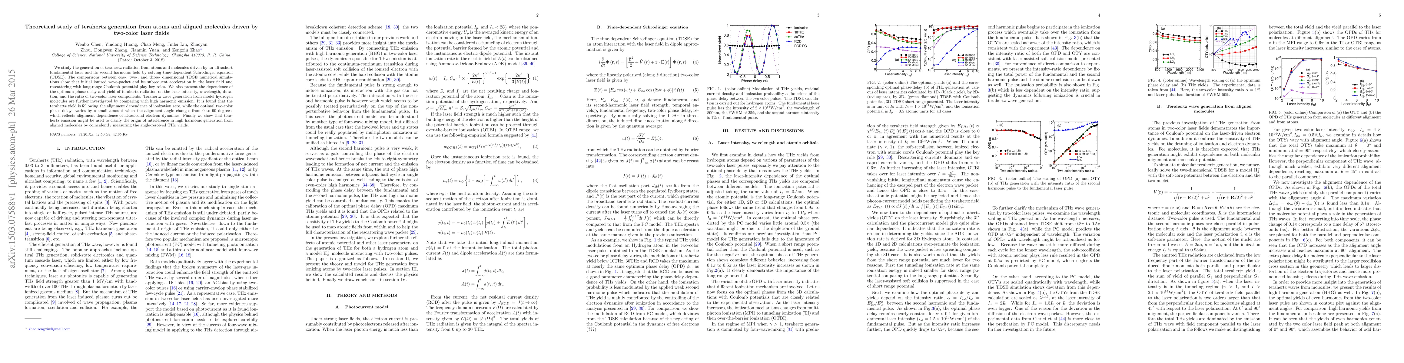 We study the generation of terahertz radiation from atoms and molecules driven by an ultrashort fundamental laser and its second harmonic field by solving time-dependent Schr\"odinger equation (TDSE). The comparisons between one-, two-, and three- dimensional TDSE numerical simulations show that initial ionized wave-packet and its subsequent acceleration in the laser field and rescattering with long-range Coulomb potential play key roles. We also present the dependence of the optimum phase delay and yield of terahertz radiation on the laser intensity, wavelength, duration, and the ratio of two-color laser components. Terahertz wave generation from model hydrogen molecules are further investigated by comparing with high harmonic emission. It is found that the terahertz yield is following the alignment dependence of ionization rate, while the optimal two-color phase delays varies by a small amount when the alignment angle changes from 0 to 90 degrees, which reflects alignment dependence of attosecond electron dynamics. Finally we show that terahertz emission might be used to clarify the origin of interference in high harmonic generation from aligned molecules by coincidently measuring the angle-resolved THz yields.
