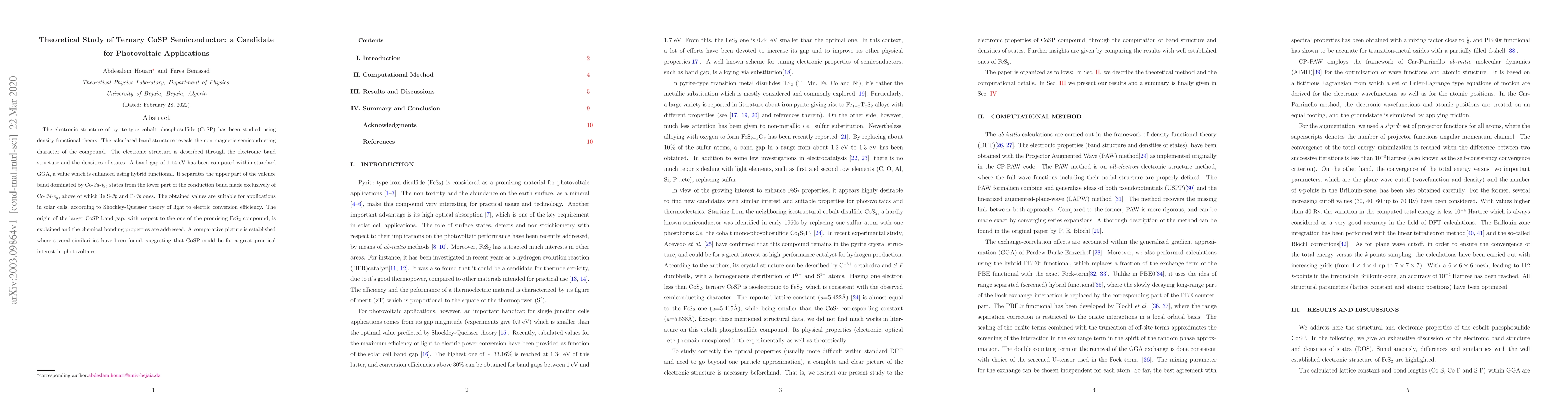 The electronic structure of pyrite-type cobalt phosphosulfide (CoSP) has been studied using density-functional theory. The calculated band structure reveals the non-magnetic semiconducting character of the compound. The electronic structure is described through the electronic band structure and the densities of states. A band gap of 1.14 eV has been computed within standard GGA, a value which is enhanced using hybrid functional. It separates the upper part of the valence band dominated by Co-3d-t2g states from the lower part of the conduction band made exclusively of Co-3d-eg , above of which lie S-3p and P-3p ones. The obtained values are suitable for applications in solar cells, according to Shockley-Queisser theory of light to electric conversion efficiency. The origin of the larger CoSP band gap, with respect to the one of the promising FeS2 compound, is explained and the chemical bonding properties are addressed. A comparative picture is established where several similarities have been found, suggesting that CoSP could be for a great practical interest in photovoltaics.