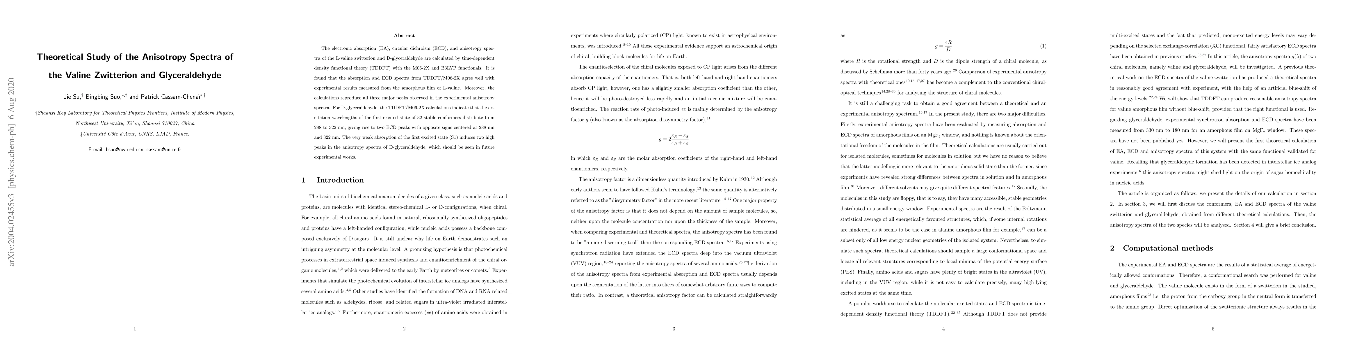 The electronic absorption (EA), circular dichroism (ECD), and anisotropy spectra of the L-valine zwitterion and D-glyceraldehyde are calculated by time-dependent density functional theory (TDDFT) with the M06-2X and B3LYP functionals. It is found that the absorption and ECD spectra from TDDFT/M06-2X agree well with experimental results measured from amorphous film of L-valine. Moreover, the calculations reproduce all three major peaks observed in the experimental anisotropy spectra. For D-glyceraldehyde, the TDDFT/M06-2X calculations indicate that the excitation wavelengths of the first excited state of 32 stable conformers distribute from 288 to 322 nm, giving rise to two ECD peaks with opposite signs centered at 288 nm and 322 nm. The very weak absorption of the first excited state (S1) induces two high peaks in the anisotropy spectra of D-glyceraldehyde, which should be seen in future experimental works.