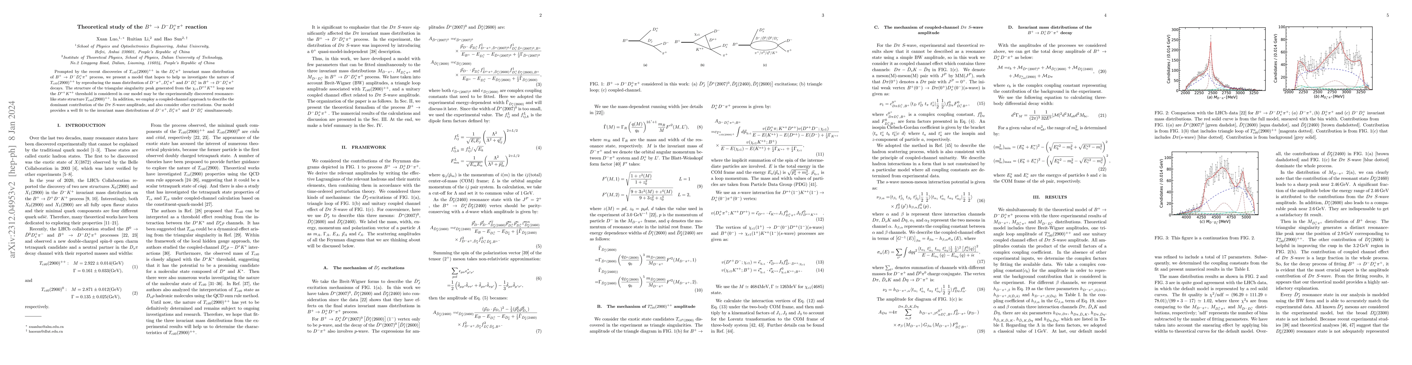 Prompted by the recent discoveries of $T_{c\bar{s}0}(2900)^{++}$ in the $D_s^+\pi^+$ invariant mass distribution of $B^+\to D^-D_s^+\pi^+$ process, we present a model that hopes to help us investigate the nature of $T_{c\bar{s}0}(2900)^{++}$ by reproducing the mass distribution of $D^-\pi^+, D_s^+\pi^+$ and $D^-D_s^+$ in $B^+ \to D^-D_s^+\pi^+$ decays. The structure of the triangular singularity peak generated from the $\chi_{c1}D^{*+}K^{*+}$ loop near the $D^{*+}K^{*+}$ threshold is considered in our model may be the experimentally discovered resonance-like state structure $T_{c\bar{s}0}(2900)^{++}$. In addition, we employ a coupled-channel approach to describe the dominant contribution of the $D\pi$ $S\text{-wave}$ amplitude, and also consider other excitations. Our model provides a well fit to the invariant mass distributions of $D^-\pi^+, D_s^+\pi^+$ and $D^-D_s^+$ simultaneously.
