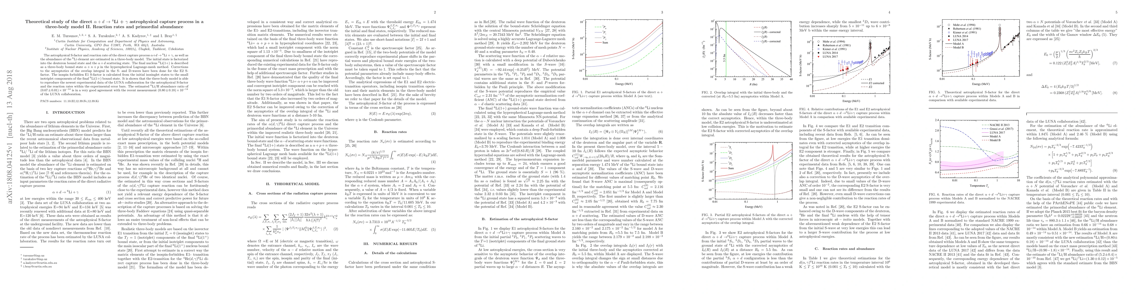 This paper estimates the astrophysical S-factor and reaction rate for the $\alpha+d$ $\rightarrow$ $^6$Li + $\gamma$ process using a three-body model, showing good agreement with experimental data and recent measurements of the $^6$Li/H abundance ratio. The model accurately reproduces the LUNA collaboration's results and provides a precise $^6$Li/H abundance ratio of $(0.67 \pm 0.01)\times 10^{-14}$.