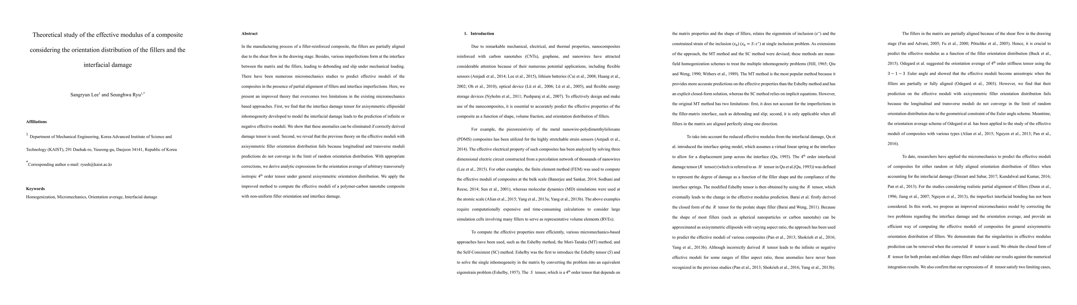 In the manufacturing process of a filler-reinforced composite, the fillers in the matrix are aligned due to the shear flow occurring during the drawing stage, and the interface between the matrix and the fillers form various imperfections that lead to debonding and slip under mechanical loading. Hence, there have been numerous micromechanics studies to predict effective moduli of the composites in the presence of partial alignment of fillers and interface imperfections. In this study, we present an improved theory that overcomes two limitations in the existing micromechanics based approaches. First, we find that the interface damage tensor, which has been developed to model the weakened interface between matrix and fillers, has singularities that cause non-physical predictions (such as infinite or negative effective moduli). We correct the mathematical mistakes to remove singularities and derive analytic expressions of the damage tensor for ellipsoidal inclusions. Second, we reveal that the previous theory on the effective moduli with axisymmetric filler orientation distribution fails because the longitudinal and transverse moduli do not converge in the limit of random orientation distribution. With appropriate corrections, we derive an analytic expression for the orientation average of arbitrary transversely isotropic 4th order tensor under general axisymmetric orientation distribution. We apply the improved method to compute the effective moduli of a representative composite with non-uniform filler orientation and interface damage.