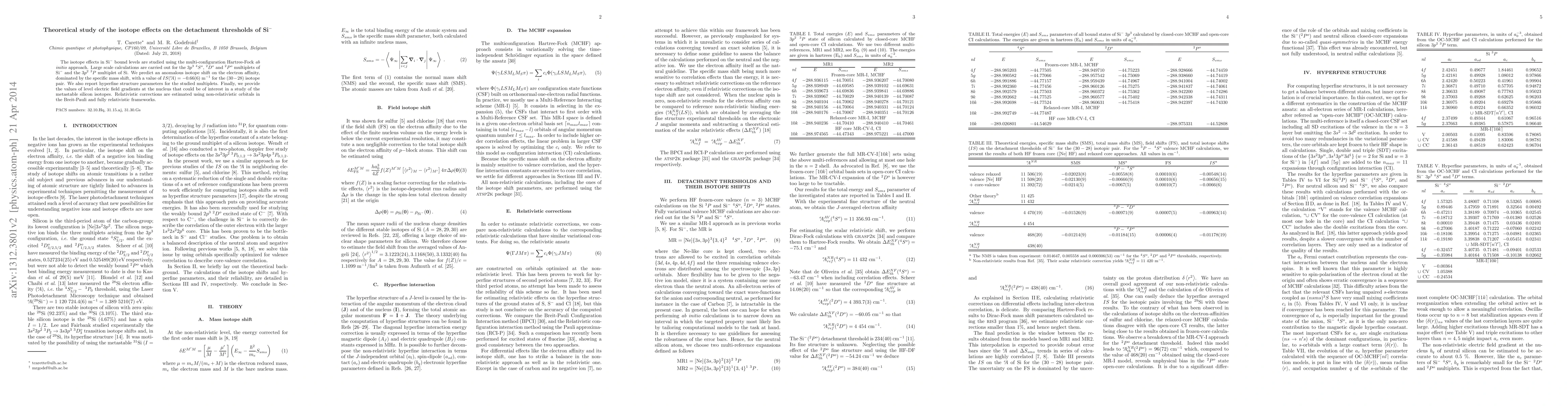 This study investigates isotope effects on Si$^-$ detachment thresholds using multi-configuration Hartree-Fock ab initio methods, predicting an anomalous isotope shift in electron affinity for the ($30-28$) isotope pair and providing hyperfine structure parameters and electric field gradients for metastable silicon isotopes. Relativistic corrections are also estimated.
