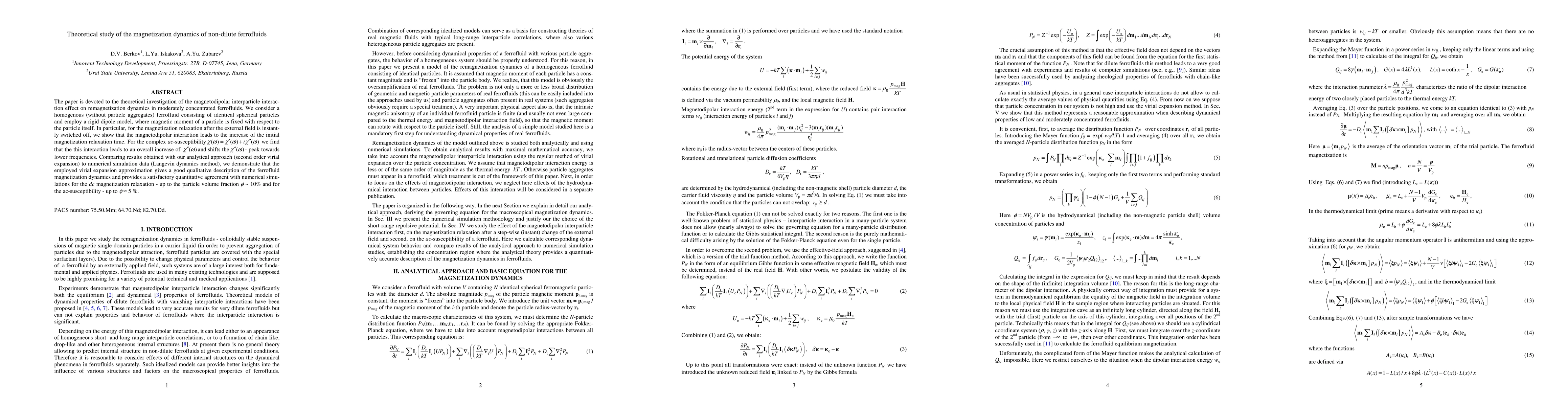 This paper investigates the magnetodipolar interaction's effect on remagnetization dynamics in non-dilute ferrofluids using a rigid dipole model. The study finds that this interaction increases initial magnetization relaxation time and shifts the peak of the imaginary susceptibility towards lower frequencies, with analytical results matching numerical simulations up to 10% particle volume fraction for dc relaxation and 5% for ac-susceptibility.
