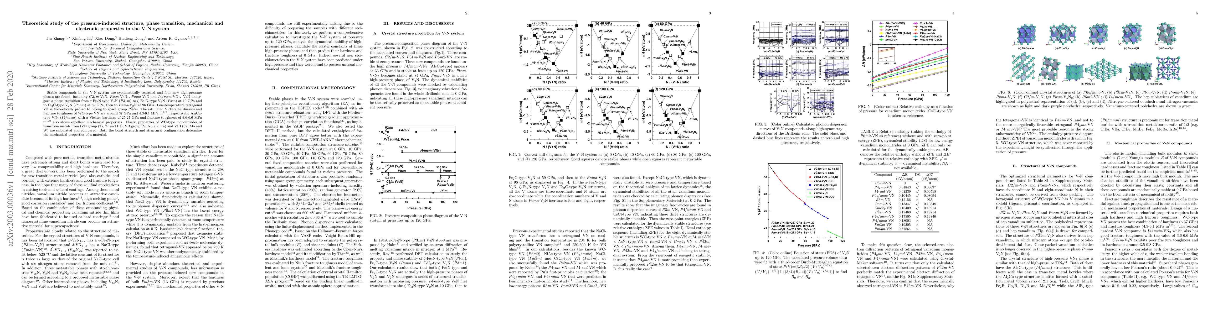 Stable compounds in the V-N system are systematically searched and four new high-pressure phases are found, including C2/m-V$_9$N, Pbam-V$_5$N$_2$, Pnma-V$_2$N and I4/mcm-VN$_2$. V$_2$N undergoes a phase transition from $\varepsilon$-Fe$_2$N-type V$_2$N (P$\bar{3}$1m) to $\zeta$-Fe$_2$N-type V$_2$N (Pbcn) at 10 GPa and to Fe$_2$C-type V$_2$N (Pnnm) at 59 GPa, then to Pnma-V$_2$N at 96 GPa. Low-temperature tetragonal VN is theoretically proved to belong to space group P$\bar{4}$2m. The estimated Vickers hardnesses and fracture toughness of WC-type VN are around 37 GPa and 4.3-6.1 MPa m$^{1/2}$, respectively. Al$_2$Cu-type VN$_2$ (I4/mcm) with a Vickers hardness of 25-27 GPa and fracture toughness of 3.6-6.6 MPa m$^{1/2}$ also shows excellent mechanical properties. Elastic properties of WC-type mononitrides of transition metals from IVB group (Ti, Zr and Hf), VB group (V, Nb and Ta) and VIB (Cr, Mo and W) are calculated and compared. Both the bond strength and structural configuration determine the mechanical properties of a material.