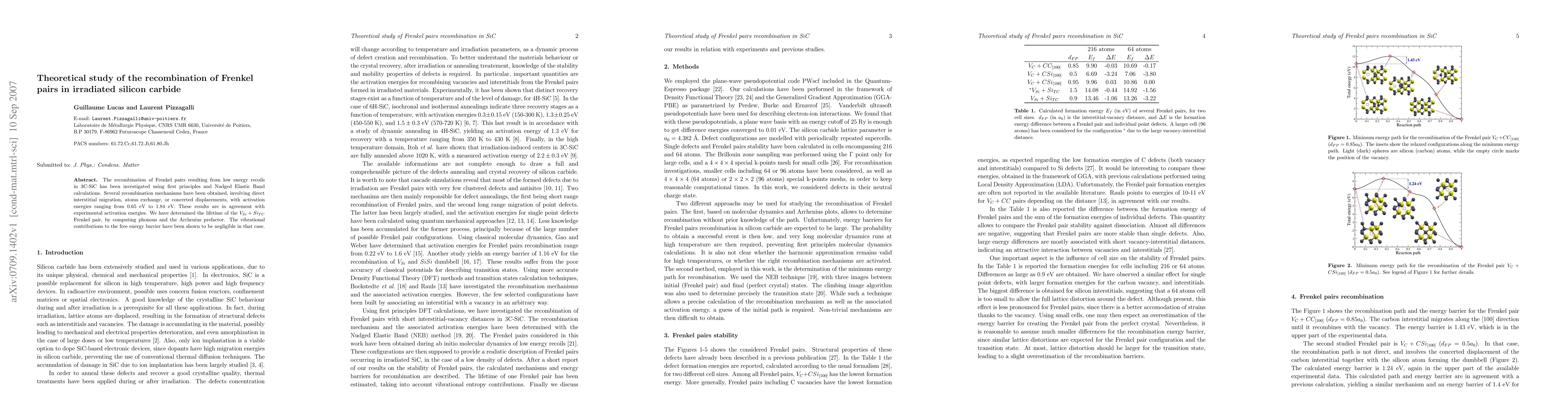 The recombination of Frenkel pairs resulting from low energy recoils in 3C-SiC has been investigated using first principles and Nudged Elastic Band calculations. Several recombination mechanisms have been obtained, involving direct interstitial migration, atoms exchange, or concerted displacements, with activation energies ranging from 0.65 eV to 1.84 eV. These results are in agreement with experimental activation energies. We have determined the lifetime of the $V_{Si}+Si_{TC}$ Frenkel pair, by computing phonons and the Arrhenius prefactor. The vibrational contributions to the free energy barrier have been shown to be negligible in that case.