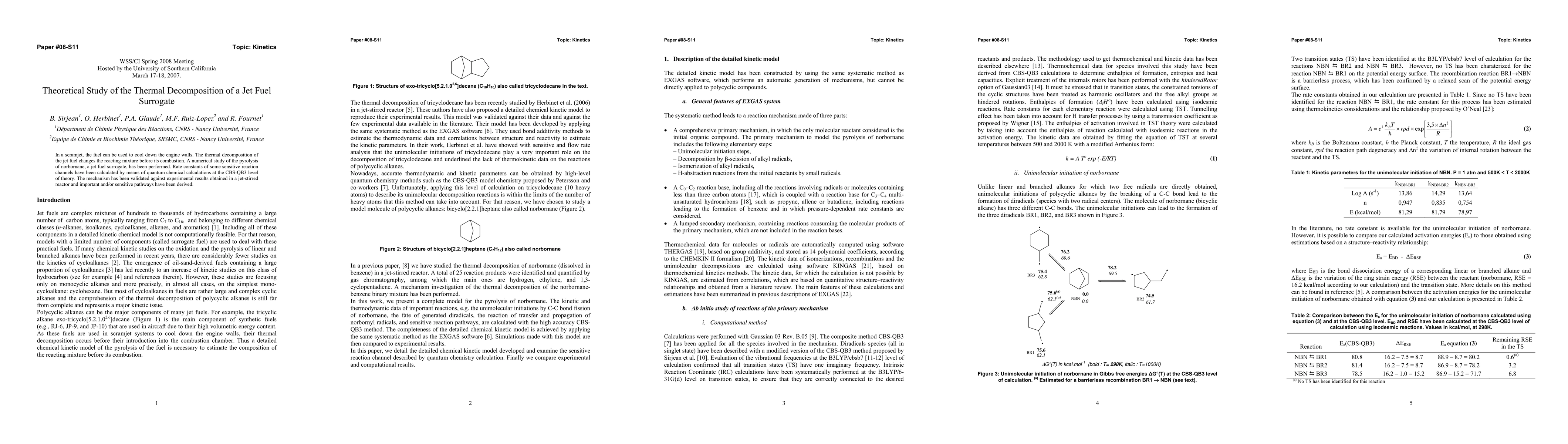 In a scramjet, the fuel can be used to cool down the engine walls. The thermal decomposition of the jet fuel changes the reacting mixture before its combustion. A numerical study of the pyrolysis of norbornane, a jet fuel surrogate, has been performed. Rate constants of some sensitive reaction channels have been calculated by means of quantum chemical calculations at the CBS-QB3 level of theory. The mechanism has been validated against experimental results obtained in a jet-stirred reactor and important and/or sensitive pathways have been derived.