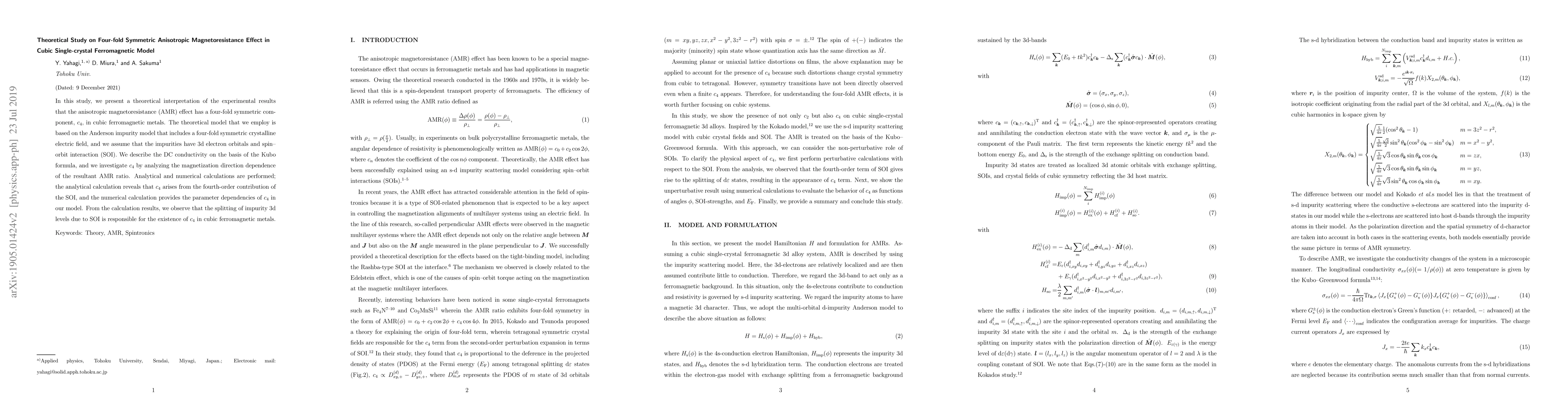 This research theoretically explains the four-fold symmetric anisotropic magnetoresistance (AMR) effect in cubic ferromagnetic metals using the Anderson impurity model. The study finds that the fourth-order spin-orbit interaction (SOI) causes this effect, with numerical calculations revealing parameter dependencies. The splitting of impurity 3d levels due to SOI is identified as the origin of the four-fold symmetric AMR component.