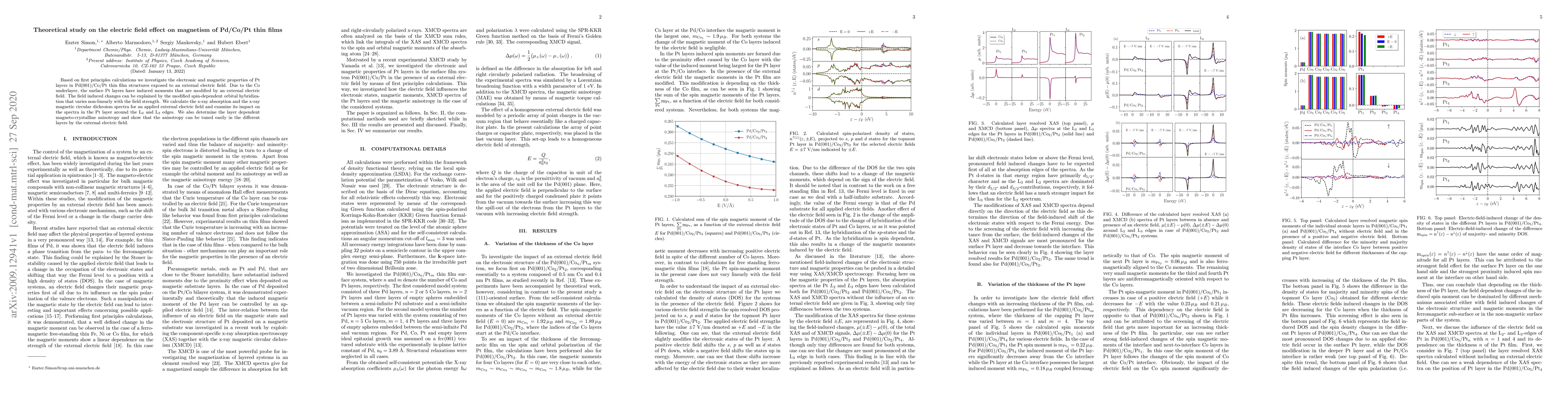 This study employs first principles calculations to explore the impact of an external electric field on the electronic and magnetic properties of Pt layers in Pd/Co/Pt thin films, showing that the field modifies the induced moments in Pt through non-linear changes in spin-dependent orbital hybridization. The research also examines x-ray absorption and magnetic circular dichroism spectra to illustrate the field's effect on the Pt layer and reveals that magneto-crystalline anisotropy in the layers can be easily tuned by the electric field.