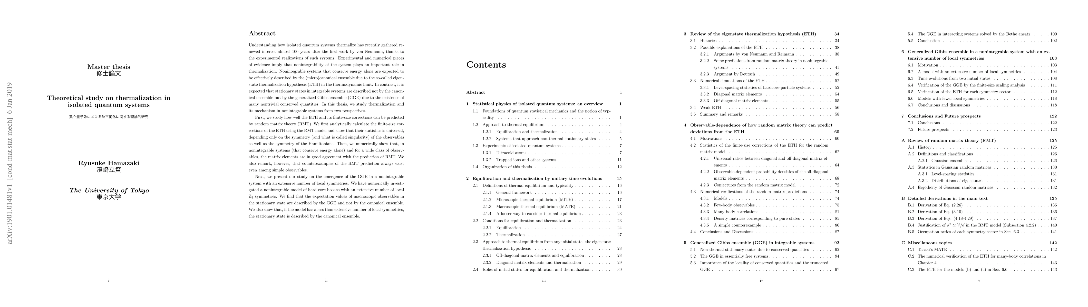 This paper investigates thermalization mechanisms in isolated quantum systems, focusing on nonintegrable systems and the Eigenstate Thermalization Hypothesis (ETH). It explores the predictive power of random matrix theory for ETH and finite-size corrections, and examines the emergence of the Generalized Gibbs Ensemble (GGE) in nonintegrable systems with extensive local symmetries.