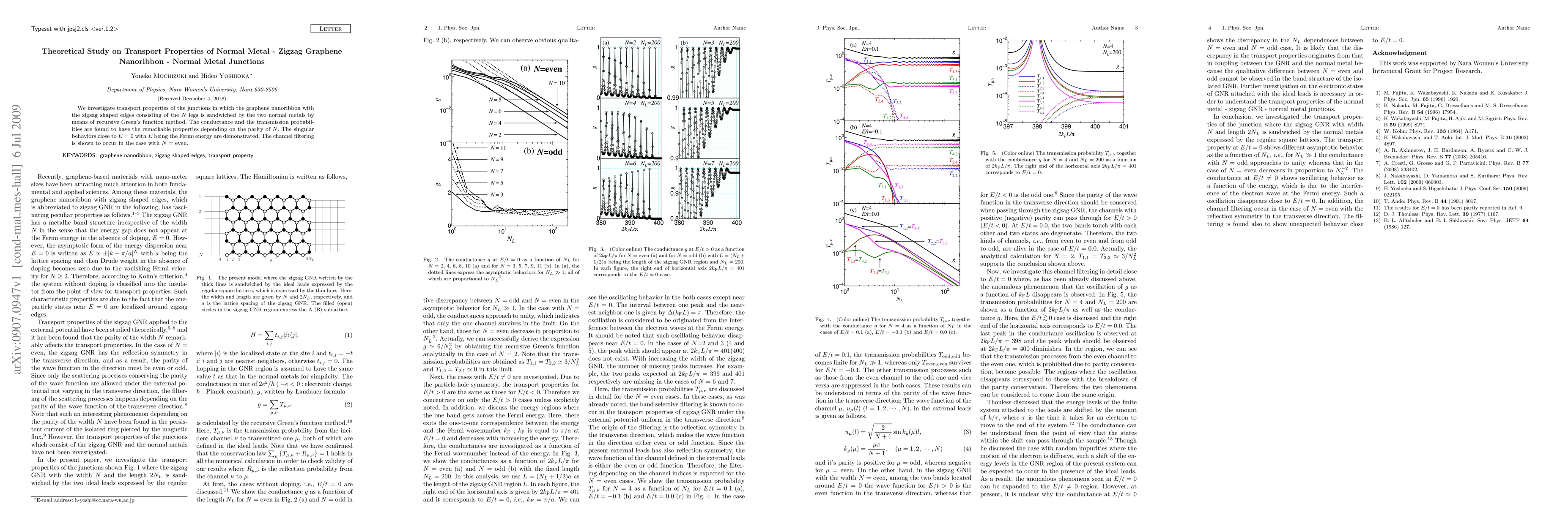 We investigate transport properties of the junctions in which the graphene nanoribbon with the zigzag shaped edges consisting of the $N$ legs is sandwiched by the two normal metals by means of recursive Green's function method. The conductance and the transmission probabilities are found to have the remarkable properties depending on the parity of $N$. The singular behaviors close to E=0 with $E$ being the Fermi energy are demonstrated. The channel filtering is shown to occur in the case with $N=$ even.