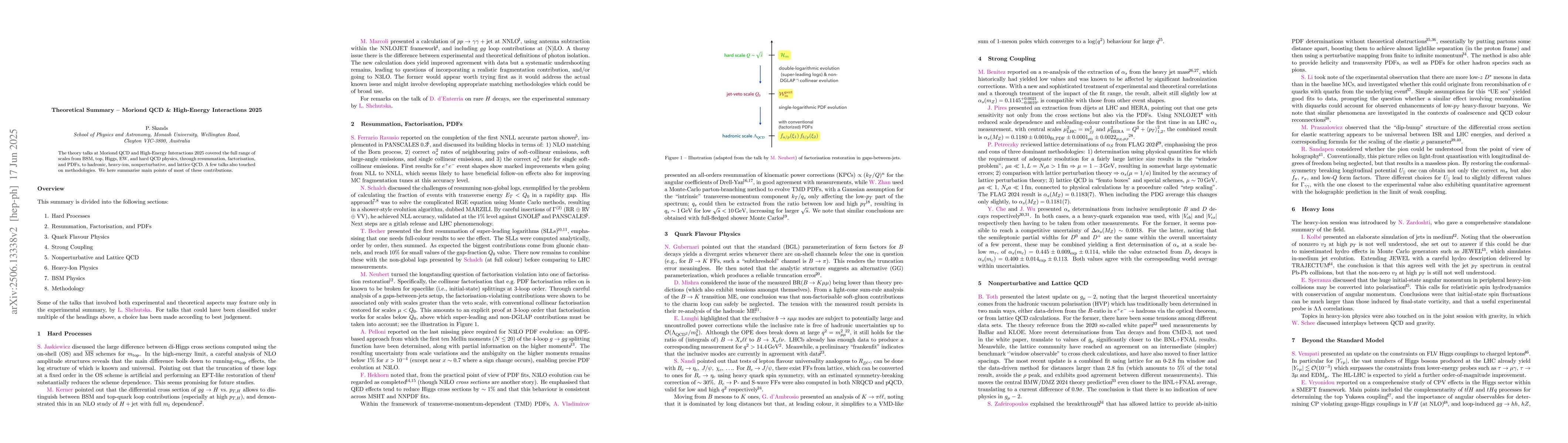 The theory talks at Moriond QCD and High-Energy Interactions 2025 covered the full range of scales from BSM, top, Higgs, EW, and hard QCD physics, through resummation, factorisation, and PDFs, to hadronic, heavy-ion, nonperturbative, and lattice QCD. A few talks also touched on methodologies. We here summarise main points of most of these contributions.